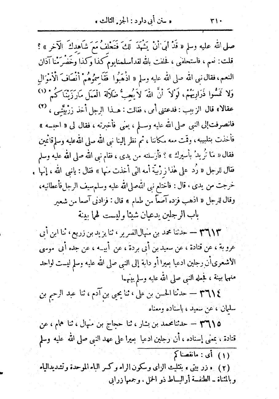 3615 - حَدَّثَنَا مُحَمَّدُ بْنُ بَشَّارٍ، حَدَّثَنَا حَجَّاجُ بْنُ مِنْهَالٍ، حَدَّثَنَا هَمَّامٌ، عَنْ قَتَادَةَ بِمَعْنَى إِسْنَادِهِ أَنَّ رَجُلَيْنِ ادَّعَيَا بَعِيرًا عَلَى عَهْدِ النَّبِيِّ صَلَّى اللهُ عَلَيْهِ وَسَلَّمَ -[311]- فَبَعَثَ كُلُّ وَاحِدٍ مِنْهُمَا شَاهِدَيْنِ فَقَسَمَهُ النَّبِيُّ صَلَّى اللهُ عَلَيْهِ وَسَلَّمَ بَيْنَهُمَا نِصْفَيْنِ