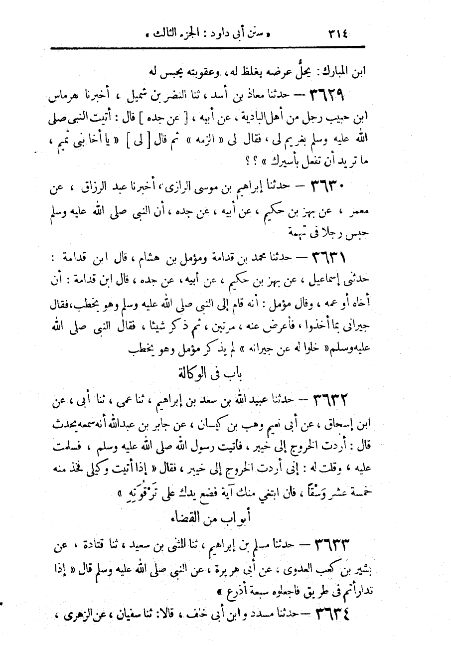 3629 - حَدَّثَنَا مُعَاذُ بْنُ أَسَدٍ، حَدَّثَنَا النَّضْرُ بْنُ شُمَيْلٍ، أَخْبَرَنَا هِرْمَاسُ بْنُ حَبِيبٍ، رَجُلٌ مِنْ أَهْلِ الْبَادِيَةِ، عَنْ أَبِيهِ، عَنْ جَدَّهِ، قَالَ: أَتَيْتُ النَّبِيَّ صَلَّى اللهُ عَلَيْهِ وَسَلَّمَ بِغَرِيمٍ لِي، فَقَالَ لِي: «§الْزَمْهُ»، ثُمَّ قَالَ لِي: «يَا أَخَا بَنِي تَمِيمٍ مَا تُرِيدُ أَنْ تَفْعَلَ بِأَسِيرِكَ؟»