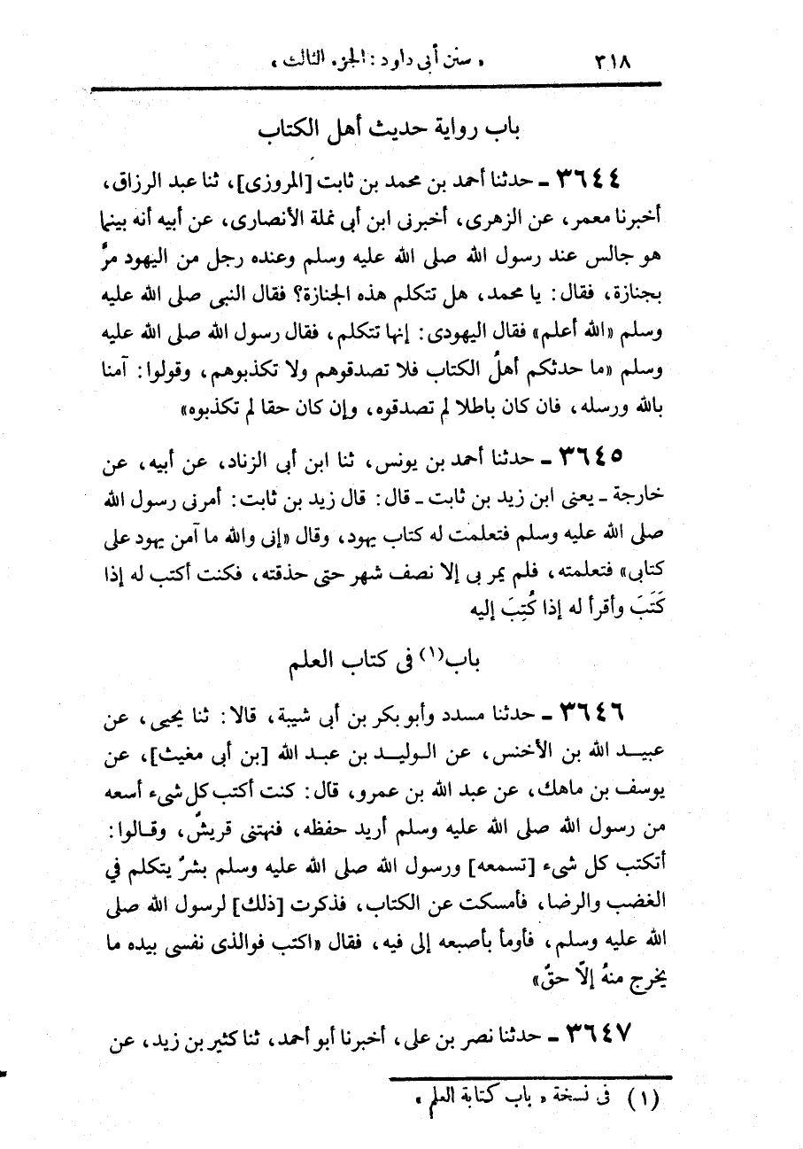 3646 - حَدَّثَنَا مُسَدَّدٌ، وَأَبُو بَكْرِ بْنُ أَبِي شَيْبَةَ، قَالَا: حَدَّثَنَا يَحْيَى، عَنْ عُبَيْدِ اللَّهِ بْنِ الْأَخْنَسِ، عَنِ الْوَلِيدِ بْنِ عَبْدِ اللَّهِ بْنِ أَبِي مُغِيثٍ، عَنْ يُوسُفَ بْنِ مَاهَكَ، عَنْ عَبْدِ اللَّهِ بْنِ عَمْرٍو، قَالَ: كُنْتُ أَكْتُبُ كُلَّ شَيْءٍ أَسْمَعُهُ مِنْ رَسُولِ اللَّهِ صَلَّى اللهُ عَلَيْهِ وَسَلَّمَ أُرِيدُ حِفْظَهُ، فَنَهَتْنِي قُرَيْشٌ وَقَالُوا: أَتَكْتُبُ كُلَّ شَيْءٍ تَسْمَعُهُ وَرَسُولُ اللَّهِ صَلَّى اللهُ عَلَيْهِ وَسَلَّمَ بَشَرٌ يَتَكَلَّمُ فِي الْغَضَبِ، وَالرِّضَا، فَأَمْسَكْتُ عَنِ الْكِتَابِ، فَذَكَرْتُ ذَلِكَ لِرَسُولِ اللَّهِ صَلَّى اللهُ عَلَيْهِ وَسَلَّمَ، فَأَوْمَأَ بِأُصْبُعِهِ إِلَى فِيهِ، فَقَالَ: «§اكْتُبْ فَوَالَّذِي نَفْسِي بِيَدِهِ مَا يَخْرُجُ مِنْهُ إِلَّا حَقٌّ»