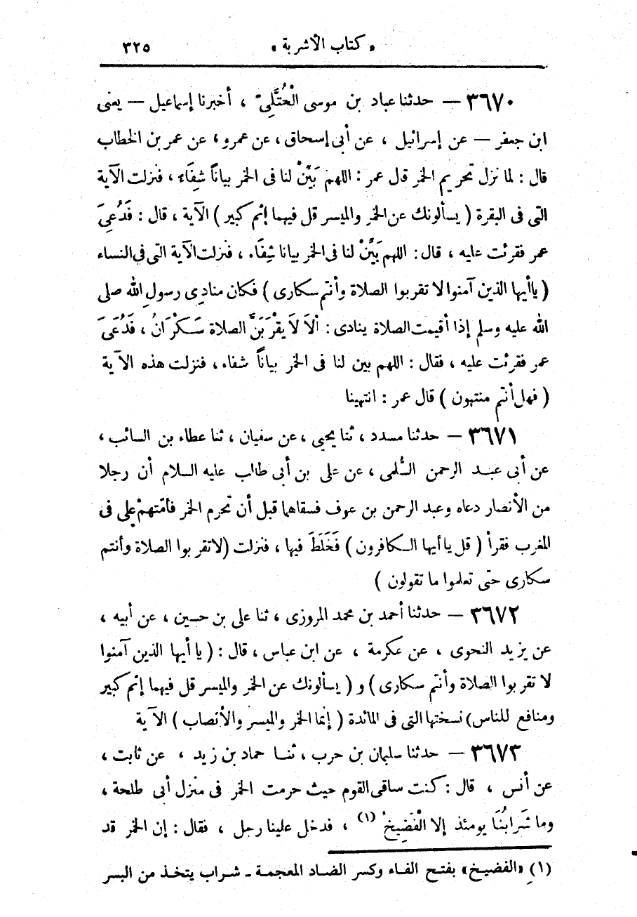3670 - حَدَّثَنَا عَبَّادُ بْنُ مُوسَى الْخُتَّلِيُّ، أَخْبَرَنَا إِسْمَاعِيلُ يَعْنِي ابْنَ جَعْفَرٍ، عَنْ إِسْرَائِيلَ، عَنْ أَبِي إِسْحَاقَ، عَنْ عَمْرٍو، عَنْ عُمَرَ بْنِ الْخَطَّابِ، قَالَ: لَمَّا نَزَلَ تَحْرِيمُ الْخَمْرِ قَالَ عُمَرُ: اللَّهُمَّ بَيِّنْ لَنَا فِي الْخَمْرِ بَيَانًا شِفَاءً، فَنَزَلَتِ الْآيَةُ الَّتِي فِي الْبَقَرَةِ {يَسْأَلُونَكَ عَنِ الْخَمْرِ وَالْمَيْسِرِ قُلْ فِيهِمَا إِثْمٌ كَبِيرٌ} [البقرة: 219] الْآيَةَ، قَالَ: فَدُعِيَ عُمَرُ فَقُرِئَتْ عَلَيْهِ، قَالَ: اللَّهُمَّ بَيِّنْ لَنَا فِي الْخَمْرِ بَيَانًا شِفَاءً، فَنَزَلَتِ الْآيَةُ الَّتِي فِي النِّسَاءِ {يَا أَيُّهَا الَّذِينَ آمَنُوا لَا تَقْرَبُوا الصَّلَاةَ وَأَنْتُمْ سُكَارَى} [النساء: 43] فَكَانَ مُنَادِي رَسُولِ اللَّهِ صَلَّى اللهُ عَلَيْهِ وَسَلَّمَ إِذَا أُقِيمَتِ الصَّلَاةُ يُنَادِي: «أَلَا §لَا يَقْرَبَنَّ الصَّلَاةَ سَكْرَانُ»، فَدُعِيَ عُمَرُ فَقُرِئَتْ عَلَيْهِ، فَقَالَ: اللَّهُمَّ بَيِّنْ لَنَا فِي الْخَمْرِ بَيَانًا شِفَاءً، فَنَزَلَتْ هَذِهِ الْآيَةُ {فَهَلْ أَنْتُمْ مُنْتَهُونَ} [المائدة: 91] قَالَ عُمَرُ: انْتَهَيْنَا