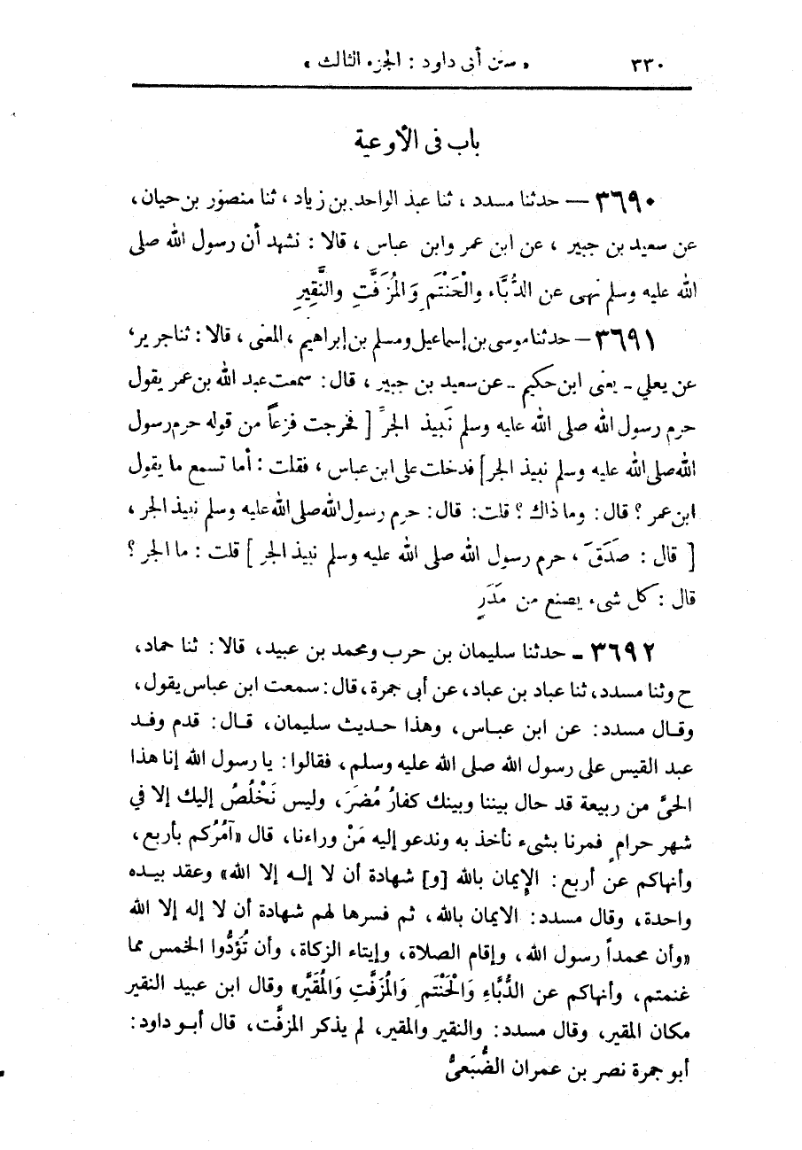 3692 - حَدَّثَنَا سُلَيْمَانُ بْنُ حَرْبٍ، وَمُحَمَّدُ بْنُ عُبَيدٍ، قَالَا: حَدَّثَنَا حَمَّادٌ، ح وحَدَّثَنَا مُسَدَّدٌ، حَدَّثَنَا عَبَّادُ بْنُ عَبَّادٍ، عَنْ أَبِي جَمْرَةَ، قَالَ: سَمِعْتُ ابْنَ عَبَّاسٍ، يَقُولُ: وَقَالَ مُسَدَّدٌ: عَنِ ابْنِ عَبَّاسٍ، - وَهَذَا حَدِيثُ سُلَيْمَانَ - قَالَ: قَدِمَ وَفْدُ عَبْدِ الْقَيْسِ عَلَى رَسُولِ اللَّهِ صَلَّى اللهُ عَلَيْهِ وَسَلَّمَ فَقَالُوا: يَا رَسُولَ اللَّهِ إِنَّا هَذَا الْحَيَّ مِنْ رَبِيعَةَ قَدْ حَالَ بَيْنَنَا وَبَيْنَكَ كُفَّارُ مُضَرَ، وَلَيْسَ نَخْلُصُ إِلَيْكَ إِلَّا فِي شَهْرٍ حَرَامٍ فَمُرْنَا بِشَيْءٍ نَأْخُذُ بِهِ وَنَدْعُو إِلَيْهِ مَنْ وَرَاءَنَا، قَالَ: " §آمُرُكُمْ بِأَرْبَعٍ، وَأَنْهَاكُمْ عَنْ أَرْبَعٍ: الْإِيمَانُ بِاللَّهِ، وَشَهَادَةُ أَنْ لَا إِلَهَ إِلَّا اللَّهُ «وَعَقَدَ بِيَدِهِ وَاحِدَةً، وَقَالَ مُسَدَّدٌ الْإِيمَانُ بِاللَّهِ، ثُمَّ فَسَّرَهَا لَهُمْ» شَهَادَةُ أَنْ لَا إِلَهَ إِلَّا اللَّهُ وَأَنَّ مُحَمَّدًا رَسُولُ اللَّهِ، وَإِقَامُ الصَّلَاةِ، وَإِيتَاءُ الزَّكَاةِ، وَأَنْ تُؤَدُّوا الْخُمُسَ مِمَّا غَنِمْتُمْ، وَأَنْهَاكُمْ عَنِ الدُّبَّاءِ وَالْحَنْتَمِ وَالْمُزَفَّتِ وَالْمُقَيَّرِ " وَقَالَ ابْنُ عُبَيْدٍ: النَّقِيرُ مَكَانَ الْمُقَيَّرِ، وَقَالَ مُسَدَّدٌ: وَالنَّقِيرُ وَالْمُقَيَّرُ، لَمْ يَذْكُرِ الْمُزَفَّتَ، قَالَ أَبُو دَاوُدَ: " أَبُو جَمْرَةَ: نَصْرُ بْنُ عِمْرَانَ الضُّبَعِيُّ "