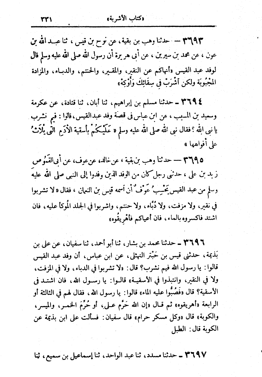 3696 - حَدَّثَنَا مُحَمَّدُ بْنُ بَشَّارٍ، حَدَّثَنَا أَبُو أَحْمَدَ، حَدَّثَنَا سُفْيَانُ، عَنْ عَلِيِّ بْنِ بَذِيمَةَ، حَدَّثَنِي قَيْسُ بْنُ حَبْتَرٍ النَّهْشَلِيُّ، عَنِ ابْنِ عَبَّاسٍ، أَنَّ وَفْدَ عَبْدِ الْقَيْسِ، قَالُوا: يَا رَسُولَ اللَّهِ فِيمَ نَشْرَبُ؟ قَالَ: «§لَا تَشْرَبُوا فِي الدُّبَّاءِ، وَلَا فِي الْمُزَفَّتِ، وَلَا فِي النَّقِيرِ، وَانْتَبِذُوا فِي الْأَسْقِيَةِ» قَالُوا: يَا رَسُولَ اللَّهِ، فَإِنِ اشْتَدَّ فِي الْأَسْقِيَةِ؟ قَالَ: «فَصُبُّوا عَلَيْهِ الْمَاءَ» قَالُوا: يَا رَسُولَ اللَّهِ، فَقَالَ لَهُمْ فِي الثَّالِثَةِ أَوِ الرَّابِعَةِ «أَهْرِيقُوهُ» ثُمَّ قَالَ: «إِنَّ اللَّهَ حَرَّمَ عَلَيَّ، أَوْ حُرِّمَ الْخَمْرُ، وَالْمَيْسِرُ، وَالْكُوبَةُ» قَالَ: «وَكُلُّ مُسْكِرٍ حَرَامٌ» قَالَ سُفْيَانُ: فَسَأَلْتُ عَلِيَّ بْنَ بَذِيمَةَ عَنِ الكُوبَةِ، قَالَ: «الطَّبْلُ»