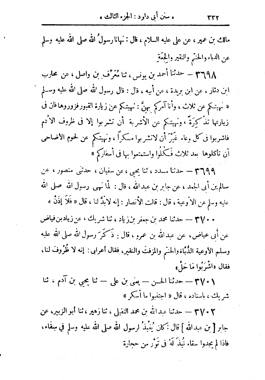 3700 - حَدَّثَنَا مُحَمَّدُ بْنُ جَعْفَرِ بْنِ زِيَادٍ، حَدَّثَنَا شَرِيكٌ، عَنْ زِيَادِ بْنِ فَيَّاضٍ، عَنْ أَبِي عَيَّاضٍ، عَنْ عَبْدِ اللَّهِ بْنِ عَمْرٍو، قَالَ: ذَكَرَ رَسُولُ اللَّهِ صَلَّى اللهُ عَلَيْهِ وَسَلَّمَ الْأَوْعِيَةَ الدُّبَّاءَ، وَالْحَنْتَمَ، وَالْمُزَفَّتَ، وَالنَّقِيرَ، فَقَالَ أَعْرَابِيٌّ: إِنَّهُ لَا ظُرُوفَ لَنَا فَقَالَ: «§اشْرَبُوا مَا حَلَّ»
