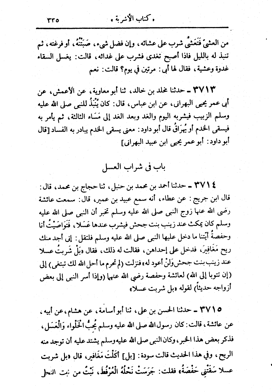 3715 - حَدَّثَنَا الْحَسَنُ بْنُ عَلِيٍّ، حَدَّثَنَا أَبُو أُسَامَةَ، عَنْ هِشَامٍ، عَنْ أَبِيهِ، عَنْ عَائِشَةَ، قَالَتْ: «كَانَ رَسُولُ اللَّهِ صَلَّى اللهُ عَلَيْهِ وَسَلَّمَ يُحِبُّ الْحَلْوَاءَ وَالْعَسَلَ»، فَذَكَرَ بَعْضَ هَذَا الْخَبَرِ، وَكَانَ النَّبِيُّ صَلَّى اللهُ عَلَيْهِ وَسَلَّمَ يَشْتَدُّ عَلَيْهِ أَنْ تُوجَدَ مِنْهُ الرِّيحُ، وَفِي هَذَا الْحَدِيثِ قَالَتْ: سَوْدَةُ: بَلْ أَكَلْتَ مَغَافِيرَ، قَالَ: «بَلْ شَرِبْتُ عَسَلًا سَقَتْنِي حَفْصَةُ» فَقُلْتُ: جَرَسَتْ نَحْلُهُ الْعُرْفُطَ، نَبْتٌ مِنْ نَبْتِ النَّحْلِ -[336]-. قَالَ أَبُو دَاوُدَ: " الْمَغَافِيرُ: مُقْلَةٌ، وَهِيَ صَمْغَةٌ، وَجَرَسَتْ: رَعَتْ، وَالْعُرْفُطُ: نَبْتٌ مِنْ نَبْتِ النَّحْلِ "