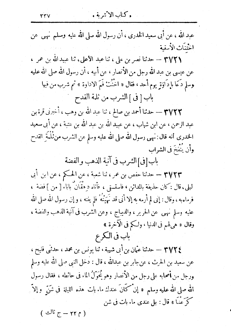 3721 - حَدَّثَنَا نَصْرُ بْنُ عَلِيٍّ، حَدَّثَنَا عَبْدُ الْأَعْلَى، حَدَّثَنَا عُبَيْدُ اللَّهِ بْنُ عُمَرَ، عَنْ عِيسَى بْنِ عَبْدِ اللَّهِ، رَجُلٌ مِنَ الْأَنْصَارِ عَنْ أَبِيهِ، أَنَّ رَسُولَ اللَّهِ صَلَّى اللهُ عَلَيْهِ وَسَلَّمَ: §دَعَا بِإِدَاوَةٍ يَوْمَ أُحُدٍ فَقَالَ: «اخْنِثْ فَمَ الْإِدَاوَةِ ثُمَّ شَرِبَ مِنْ فِيهَا»