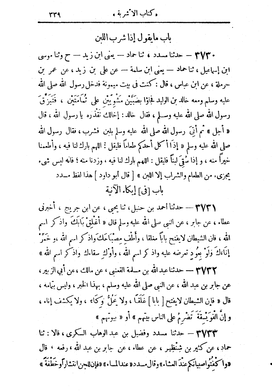 3731 - حَدَّثَنَا أَحْمَدُ بْنُ حَنْبَلٍ، حَدَّثَنَا يَحْيَى، عَنِ ابْنِ جُرَيْجٍ، أَخْبَرَنِي عَطَاءٌ، عَنْ جَابِرٍ، عَنِ النَّبِيِّ صَلَّى اللهُ عَلَيْهِ وَسَلَّمَ قَالَ: «§أَغْلِقْ بَابَكَ وَاذْكُرِ اسْمَ اللَّهِ، فَإِنَّ الشَّيْطَانَ لَا يَفْتَحُ بَابًا مُغْلَقًا، وَأَطْفِ مِصْبَاحَكَ وَاذْكُرِ اسْمَ اللَّهِ، وَخَمِّرْ إِنَاءَكَ وَلَوْ بِعُودٍ تَعْرِضُهُ عَلَيْهِ وَاذْكُرِ اسْمَ اللَّهِ، وَأَوْكِ سِقَاءَكَ وَاذْكُرِ اسْمَ اللَّهِ»