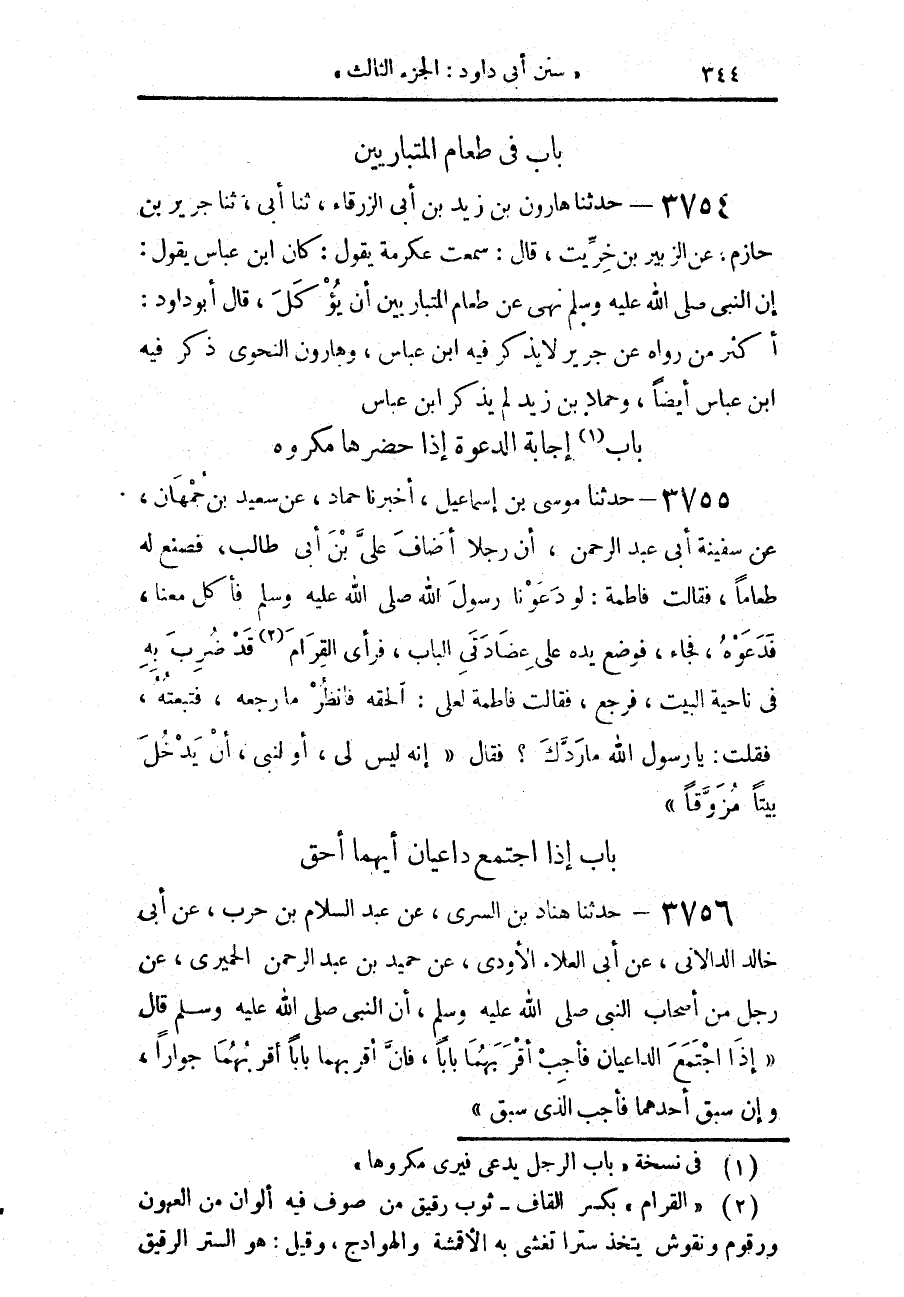 3754 - حَدَّثَنَا هَارُونُ بْنُ زَيْدِ بْنِ أَبِي الزَّرْقَاءِ، حَدَّثَنَا أَبِي، حَدَّثَنَا جَرِيرُ بْنُ حَازِمٍ، عَنِ الزُّبَيْرِ بْنِ الْخِرِّيتِ، قَالَ: سَمِعْتُ عِكْرِمَةَ، يَقُولُ كَانَ ابْنُ عَبَّاسٍ يَقُولُ: «إِنَّ النَّبِيَّ صَلَّى اللهُ عَلَيْهِ وَسَلَّمَ §نَهَى عَنْ طَعَامِ الْمُتَبَارِيَيْنِ أَنْ يُؤْكَلَ»، قَالَ أَبُو دَاوُدَ: «أَكْثَرُ مَنْ رَوَاهُ عَنْ جَرِيرٍ لَا يَذْكُرُ فِيهِ ابْنَ عَبَّاسٍ»، وَهَارُونُ النَّحْوِيُّ، ذَكَرَ فِيهِ ابْنَ عَبَّاسٍ، أَيْضًا وَحَمَّادُ بْنُ زَيْدٍ، لَمْ يَذْكُرْ ابْنَ عَبَّاسٍ