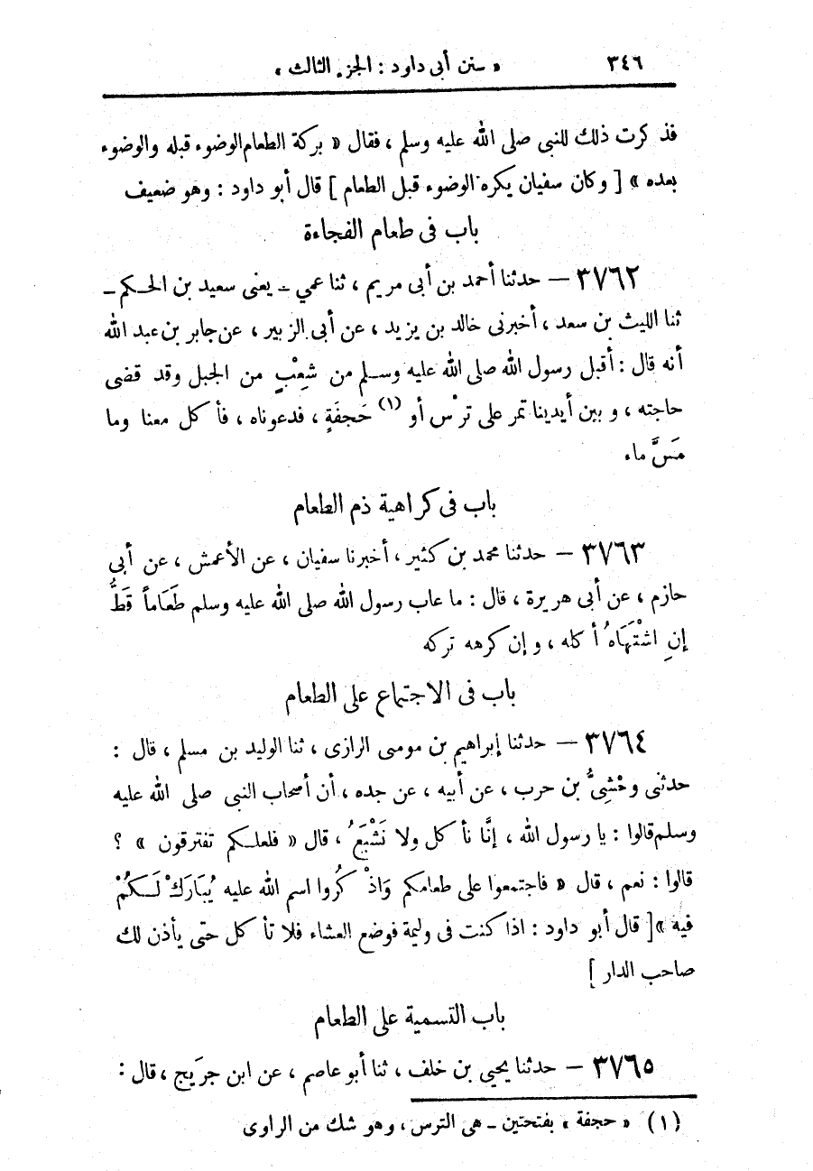 3764 - حَدَّثَنَا إِبْرَاهِيمُ بْنُ مُوسَى الرَّازِيُّ، حَدَّثَنَا الْوَلِيدُ بْنُ مُسْلِمٍ، قَالَ: حَدَّثَنِي وَحْشِيُّ بْنُ حَرْبٍ، عَنْ أَبِيهِ، عَنْ جَدِّهِ، أَنَّ أَصْحَابَ النَّبِيِّ، صَلَّى اللهُ عَلَيْهِ وَسَلَّمَ قَالُوا: يَا رَسُولَ اللَّهِ إِنَّا نَأْكُلُ وَلَا نَشْبَعُ، قَالَ: «فَلَعَلَّكُمْ تَفْتَرِقُونَ؟» قَالُوا: نَعَمْ، قَالَ: «§فَاجْتَمِعُوا عَلَى طَعَامِكُمْ، وَاذْكُرُوا اسْمَ اللَّهِ عَلَيْهِ يُبَارَكْ لَكُمْ فِيهِ» قَالَ أَبُو دَاوُدَ: «إِذَا كُنْتَ فِي وَلِيمَةٍ فَوُضِعَ الْعَشَاءُ فَلَا تَأْكُلْ حَتَّى يَأْذَنَ لَكَ صَاحِبُ الدَّارِ»