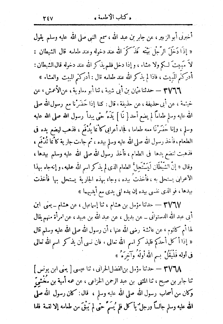 3766 - حَدَّثَنَا عُثْمَانُ بْنُ أَبِي شَيْبَةَ، حَدَّثَنَا أَبُو مُعَاوِيَةَ، عَنِ الْأَعْمَشِ، عَنْ خَيْثَمَةَ، عَنْ أَبِي حُذَيْفَةَ، عَنْ حُذَيْفَةَ، قَالَ: كُنَّا إِذَا حَضَرْنَا مَعَ رَسُولِ اللَّهِ صَلَّى اللهُ عَلَيْهِ وَسَلَّمَ طَعَامًا لَمْ يَضَعْ أَحَدُنَا يَدَهُ حَتَّى يَبْدَأَ رَسُولُ اللَّهِ صَلَّى اللهُ عَلَيْهِ وَسَلَّمَ، وَإِنَّا حَضَرْنَا مَعَهُ طَعَامًا، فَجَاءَ أَعْرَابِيٌّ كَأَنَّمَا يُدْفَعُ، فَذَهَبَ لِيَضَعَ يَدَهُ فِي الطَّعَامِ، فَأَخَذَ رَسُولُ اللَّهِ صَلَّى اللهُ عَلَيْهِ وَسَلَّمَ بِيَدِهِ، ثُمَّ جَاءَتْ جَارِيَةٌ كَأَنَّمَا تُدْفَعُ، فَذَهَبَتْ لِتَضَعَ يَدَهَا فِي الطَّعَامِ، فَأَخَذَ رَسُولُ اللَّهِ صَلَّى اللهُ عَلَيْهِ وَسَلَّمَ بِيَدِهَا، وَقَالَ: «إِنَّ §الشَّيْطَانَ لَيَسْتَحِلُّ الطَّعَامَ الَّذِي لَمْ يُذْكَرِ اسْمُ اللَّهِ عَلَيْهِ، وَإِنَّهُ جَاءَ بِهَذَا الْأَعْرَابِيِّ يَسْتَحِلُّ بِهِ، فَأَخَذْتُ بِيَدِهِ، وَجَاءَ بِهَذِهِ الْجَارِيَةِ يَسْتَحِلُّ بِهَا فَأَخَذْتُ بِيَدِهَا، فَوَالَّذِي نَفْسِي بِيَدِهِ إِنَّ يَدَهُ لَفِي يَدِي مَعَ أَيْدِيهِمَا»