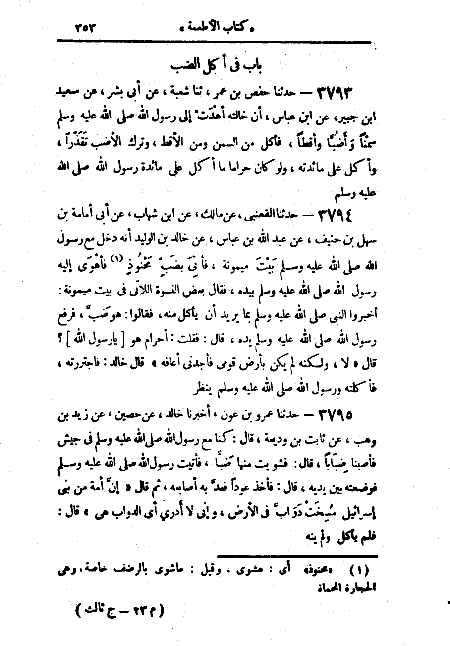 3794 - حَدَّثَنَا الْقَعْنَبِيُّ، عَنْ مَالِكٍ، عَنِ ابْنِ شِهَابٍ، عَنْ أَبِي أُمَامَةَ بْنِ سَهْلِ بْنِ حُنَيْفٍ، عَنْ عَبْدِ اللَّهِ بْنِ عَبَّاسٍ، عَنْ خَالِدِ بْنِ الْوَلِيدِ، أَنَّهُ دَخَلَ مَعَ رَسُولِ اللَّهِ صَلَّى اللهُ عَلَيْهِ وَسَلَّمَ بَيْتَ مَيْمُونَةَ فَأُتِيَ بِضَبٍّ مَحْنُوذٍ فَأَهْوَى إِلَيْهِ رَسُولُ اللَّهِ صَلَّى اللهُ عَلَيْهِ وَسَلَّمَ بِيَدِهِ، فَقَالَ: بَعْضُ النِّسْوَةِ اللَّاتِي فِي بَيْتِ مَيْمُونَةَ: أَخْبِرُوا النَّبِيَّ صَلَّى اللهُ عَلَيْهِ وَسَلَّمَ بِمَا يُرِيدُ أَنْ يَأْكُلَ مِنْهُ، فَقَالُوا: هُوَ ضَبٌّ، §فَرَفَعَ رَسُولُ اللَّهِ صَلَّى اللهُ عَلَيْهِ وَسَلَّمَ يَدَهُ، قَالَ: فَقُلْتُ: أَحَرَامٌ هُوَ يَا رَسُولَ اللَّهِ؟ قَالَ: «لَا، وَلَكِنَّهُ لَمْ يَكُنْ بِأَرْضِ قَوْمِي فَأَجِدُنِي أَعَافُهُ» قَالَ خَالِدٌ: فَاجْتَرَرْتُهُ، فَأَكَلْتُهُ وَرَسُولُ اللَّهِ صَلَّى اللهُ عَلَيْهِ وَسَلَّمَ يَنْظُرُ