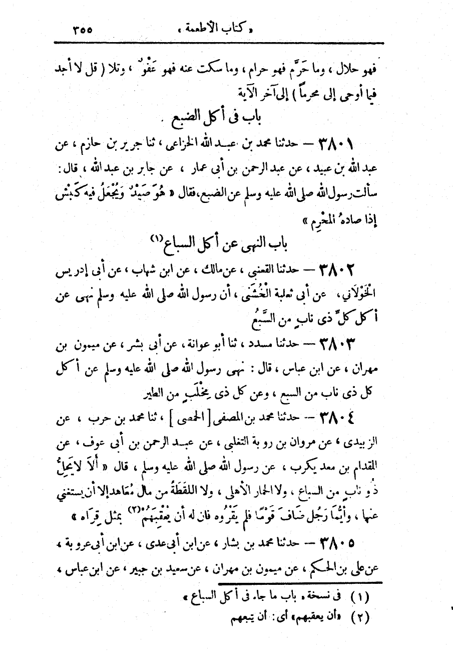 3801 - حَدَّثَنَا مُحَمَّدُ بْنُ عَبْدِ اللَّهِ الْخُزَاعِيُّ، حَدَّثَنَا جَرِيرُ بْنُ حَازِمٍ، عَنْ عَبْدِ اللَّهِ بْنِ عُبَيْدٍ، عَنْ عَبْدِ الرَّحْمَنِ بْنِ أَبِي عَمَّارٍ، عَنْ جَابِرِ بْنِ عَبْدِ اللَّهِ، قَالَ: سَأَلْتُ رَسُولَ اللَّهِ صَلَّى اللهُ عَلَيْهِ وَسَلَّمَ: عَنِ الضَّبُعِ، فَقَالَ: «§هُوَ صَيْدٌ وَيُجْعَلُ فِيهِ كَبْشٌ إِذَا صَادَهُ الْمُحْرِمُ»