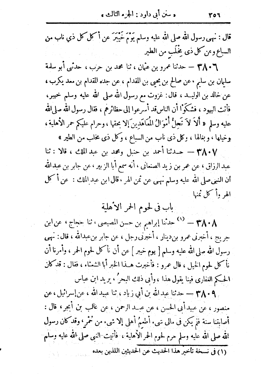 3806 - حَدَّثَنَا عَمْرُو بْنُ عُثْمَانَ، حَدَّثَنَا مُحَمَّدُ بْنُ حَرْبٍ، حَدَّثَنِي أَبُو سَلَمَةَ سُلَيْمَانُ بْنُ سُلَيْمٍ، عَنْ صَالِحِ بْنِ يَحْيَى بْنِ الْمِقْدَامِ، عَنْ جَدِّهِ الْمِقْدَامِ بْنِ مَعْدِي كَرِبَ، عَنْ خَالِدِ بْنِ الْوَلِيدِ، قَالَ: " غَزَوْتُ مَعَ رَسُولِ اللَّهِ صَلَّى اللهُ عَلَيْهِ وَسَلَّمَ خَيْبَرَ، فَأَتَتِ الْيَهُودُ فَشَكَوْا أَنَّ النَّاسَ قَدْ أَسْرَعُوا إِلَى حَظَائِرِهِمْ فَقَالَ رَسُولُ اللَّهِ صَلَّى اللهُ عَلَيْهِ وَسَلَّمَ: «§أَلَا لَا تَحِلُّ أَمْوَالُ الْمُعَاهَدِينَ إِلَّا بِحَقِّهَا، وَحَرَامٌ عَلَيْكُمْ حُمُرُ الْأَهْلِيَّةِ، وَخَيْلُهَا، وَبِغَالُهَا، وَكُلُّ ذِي نَابٍ مِنَ السِّبَاعِ، وَكُلُّ ذِي مِخْلَبٍ مِنَ الطَّيْرِ»