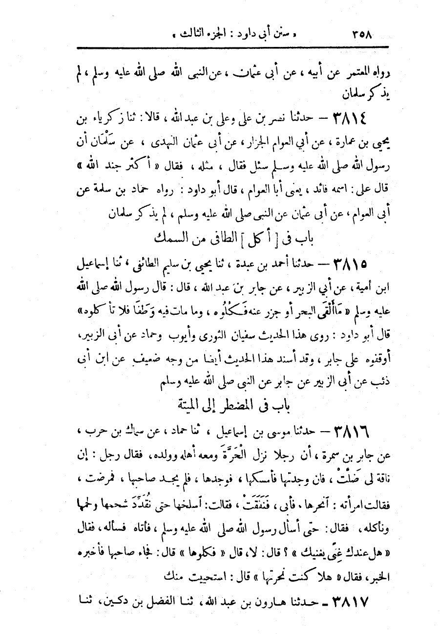 3815 - حَدَّثَنَا أَحْمَدُ بْنُ عَبْدَةَ، حَدَّثَنَا يَحْيَى بْنُ سُلَيْمٍ الطَّائِفِيُّ، حَدَّثَنَا إِسْمَاعِيلَ بْنُ أُمَيَّةَ، عَنْ أَبِي الزُّبَيْرِ، عَنْ جَابِرِ بْنِ عَبْدِ اللَّهِ، قَالَ: قَالَ رَسُولُ اللَّهِ صَلَّى اللهُ عَلَيْهِ وَسَلَّمَ: «§مَا أَلْقَى الْبَحْرُ، أَوْ جَزَرَ عَنْهُ فَكُلُوهُ، وَمَا مَاتَ فِيهِ وَطَفَا، فَلَا تَأْكُلُوهُ» قَالَ أَبُو دَاوُدَ: رَوَى هَذَا الْحَدِيثَ سُفْيَانُ الثَّوْرِيُّ، وَأَيُّوبُ، وَحَمَّادٌ، عَنْ أَبِي الزُّبَيْرِ، أَوْقَفُوهُ عَلَى جَابِرٍ وَقَدْ أُسْنِدَ هَذَا الْحَدِيثُ أَيْضًا مِنْ وَجْهٍ ضَعِيفٍ عَنْ ابْنِ أَبِي ذِئْبٍ، عَنْ أَبِي الزُّبَيْرِ، عَنْ جَابِرٍ عَنِ النَّبِيِّ صَلَّى اللهُ عَلَيْهِ وَسَلَّمَ