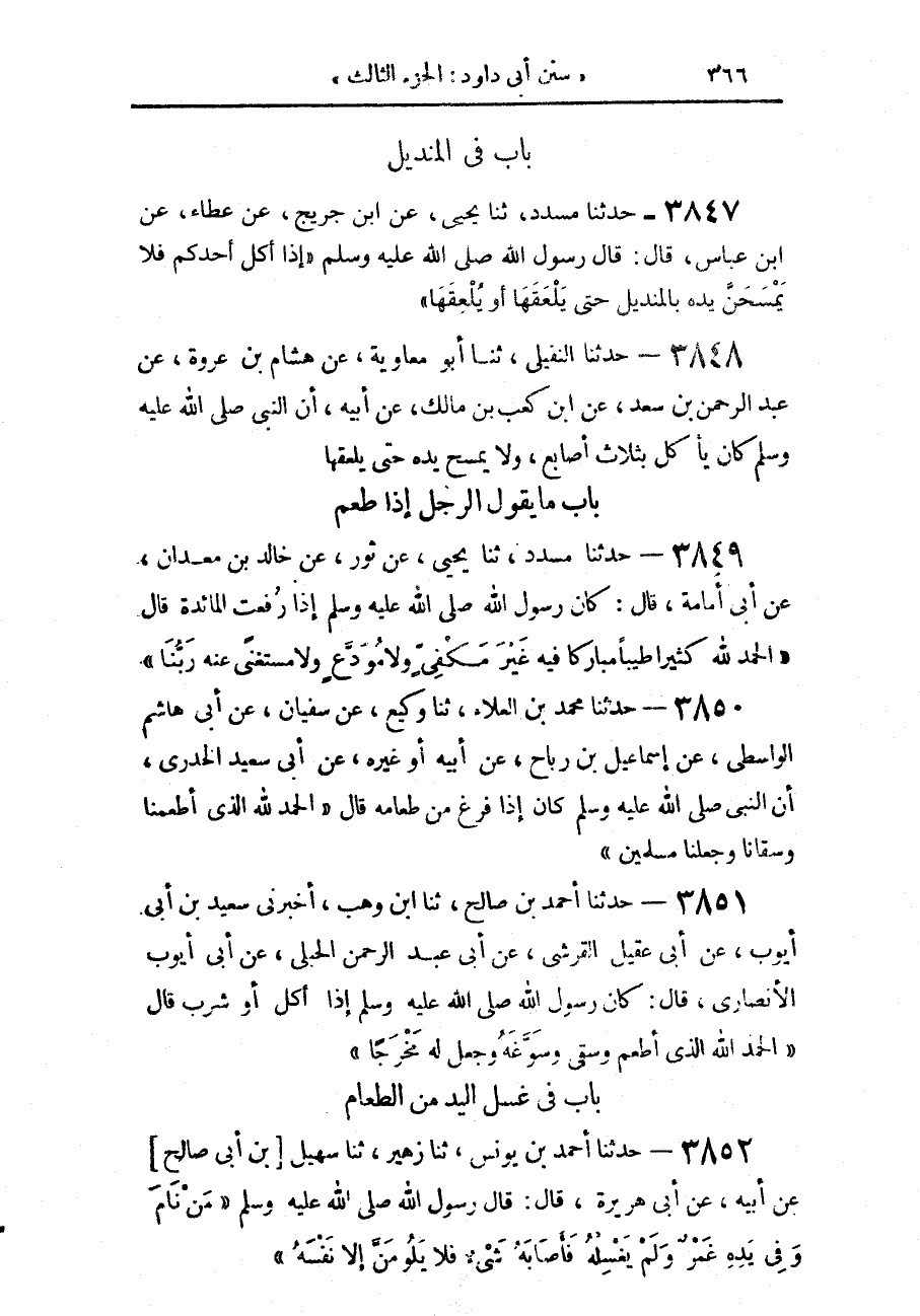 3849 - حَدَّثَنَا مُسَدَّدٌ، حَدَّثَنَا يَحْيَى، عَنْ ثَوْرٍ، عَنْ خَالِدِ بَنِ مَعْدَانَ، عَنْ أَبِي أُمَامَةَ، قَالَ كَانَ رَسُولُ اللَّهِ صَلَّى اللهُ عَلَيْهِ وَسَلَّمَ: " إِذَا رُفِعَتِ الْمَائِدَةُ قَالَ: «§الْحَمْدُ لِلَّهِ حَمْدًا كَثِيرًا طَيِّبًا مُبَارَكًا فِيهِ غَيْرَ مَكْفِيٍّ، وَلَا مُوَدَّعٍ، وَلَا مُسْتَغْنًى عَنْهُ رَبُّنَا»
