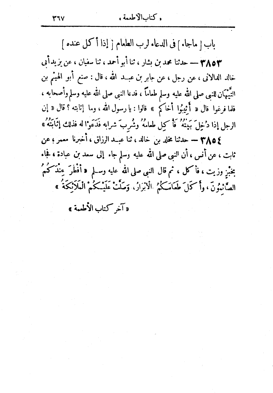 3854 - حَدَّثَنَا مَخْلَدُ بْنُ خَالِدٍ، حَدَّثَنَا عَبْدُ الرَّزَّاقِ، أَخْبَرَنَا مَعْمَرٌ، عَنْ ثَابِتٍ، عَنْ أَنَسٍ، أَنَّ النَّبِيَّ صَلَّى اللهُ عَلَيْهِ وَسَلَّمَ جَاءَ إِلَى سَعْدِ بْنِ عُبَادَةَ، فَجَاءَ بِخُبْزٍ وَزَيْتٍ، فَأَكَلَ، ثُمَّ قَالَ النَّبِيُّ صَلَّى اللهُ عَلَيْهِ وَسَلَّمَ «§أَفْطَرَ عِنْدَكُمُ الصَّائِمُونَ، وَأَكَلَ طَعَامَكُمُ الْأَبْرَارُ، وَصَلَّتْ عَلَيْكُمُ الْمَلَائِكَةُ»
