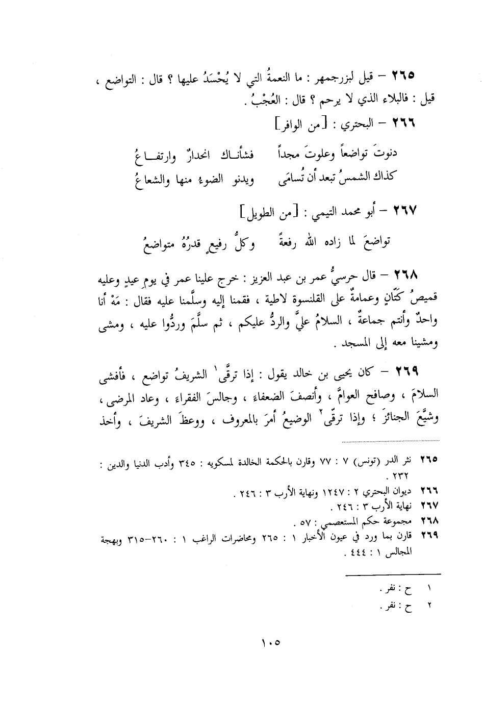«269» - كان يحيى بن خالد يقول: إذا ترقّى [1] الشريف تواضع، فأفشى السلام، وصافح العوامّ، وأنصف الضعفاء، وجالس الفقراء، وعاد المرضى، وشيّع الجنائز؛ وإذا ترقّى [2] الوضيع أمر بالمعروف، ووعظ الشريف، وأخذ
