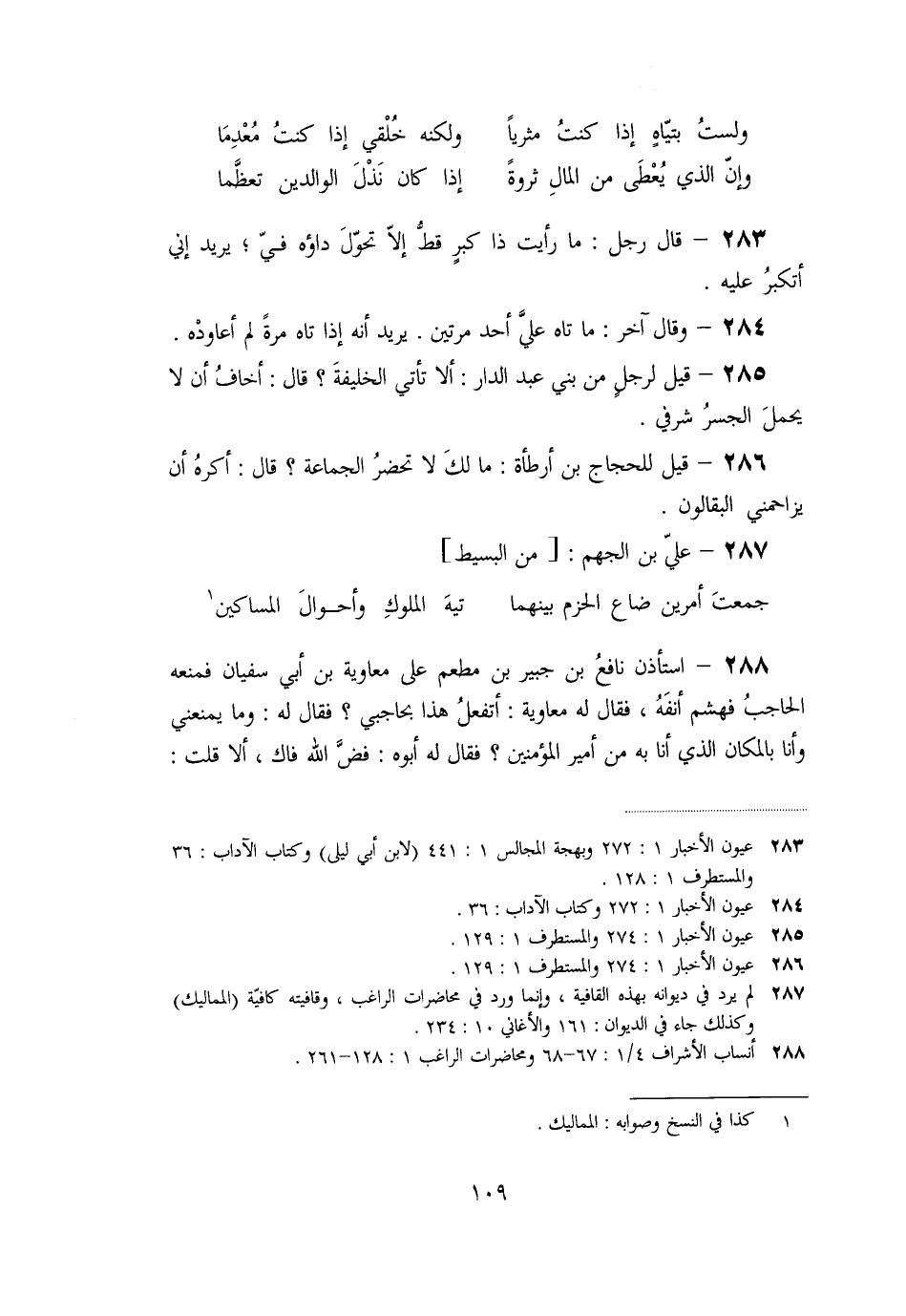 «285» - قيل لرجل من بني عبد الدار: ألا تأتي الخليفة؟ قال: أخاف أن لا يحمل الجسر شرفي.