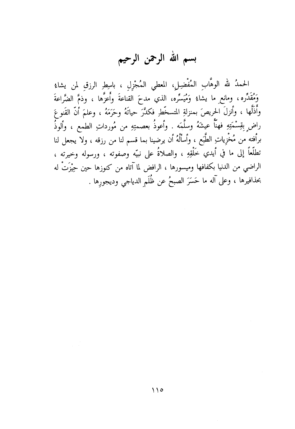الحمد لله الوهّاب المفضل، المعطي المجزل، باسط الرزق لمن يشاء ومقدّره، ومانع ما يشاء وميسّره، الذي مدح القناعة وأعزّها، وذمّ الضّراعة وأذلّها، وأنزل الحريص بمنزلة المتسخّط فكدّر حياته وحرمه، وعلم أنّ القنوع راض بقسمته فهنّأ عيشه وسلّمه. وأعوذ بعصمته من موردات الطمع، وألوذ برأفته من مخزيات الطّبع، وأسأله أن يرضينا بما قسم لنا من رزقه، ولا يجعل لنا تطلّعا إلى ما في أيدي خلقه، والصلاة على نبيّه وصفوته، ورسوله وخيرته، الراضي من الدنيا بكفافها وميسورها، الرافض لما آتاه من كنوزها حين حيزت له بحذافيرها، وعلى آله ما حسر الصبح عن ظلم الدياجي وديجورها.