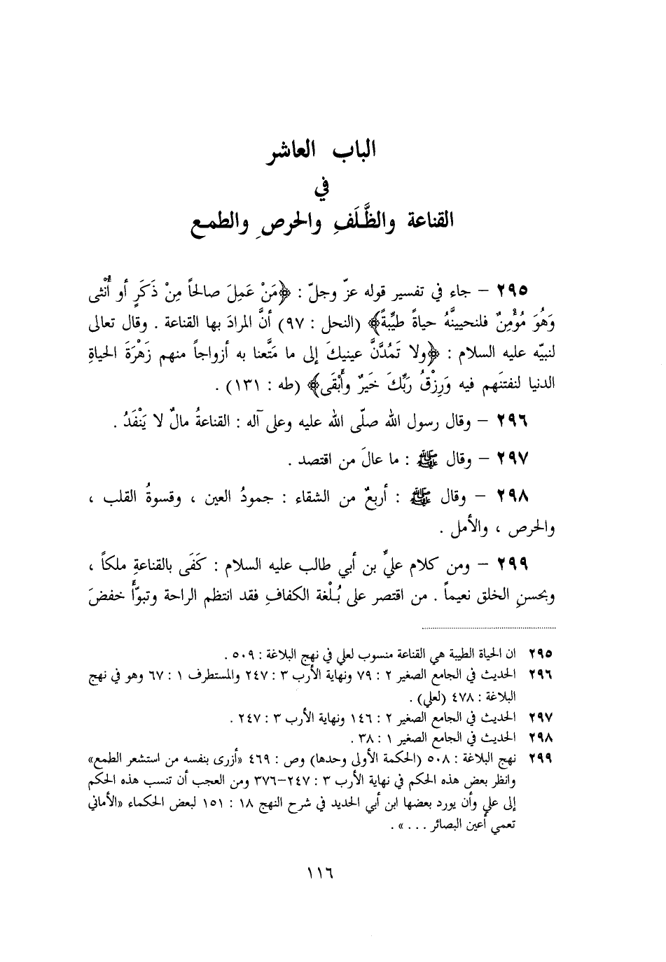 (النحل: 97) أنّ المراد بها القناعة. وقال تعالى لنبيّه عليه السلام: (وَلا تَمُدَّنَّ عَيْنَيْكَ إِلى ما مَتَّعْنا بِهِ أَزْواجاً مِنْهُمْ زَهْرَةَ الْحَياةِ الدُّنْيا لِنَفْتِنَهُمْ فِيهِ وَرِزْقُ رَبِّكَ خَيْرٌ وَأَبْقى)