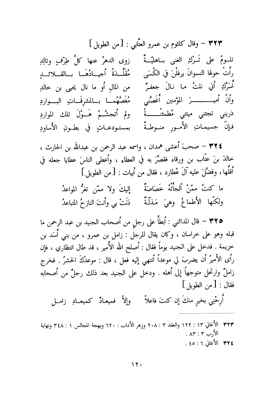 325- قال المدائني: أبطأ على رجل من أصحاب الجنيد بن عبد الرحمن ما قبله وهو على خراسان، وكان يقال للرجل: زامل بن عمرو، من بني أسد بن خزيمة. فدخل على الجنيد يوما فقال: أصلح الله الأمير، قد طال انتظاري، فإن رأى الأمير أن يضرب لي موعدا أنتهي إليه فعل، قال: موعدك الحشر. فخرج زامل وارتحل متوجها إلى أهله. ودخل على الجنيد بعد ذلك رجل من أصحابه فقال: [من الطويل]