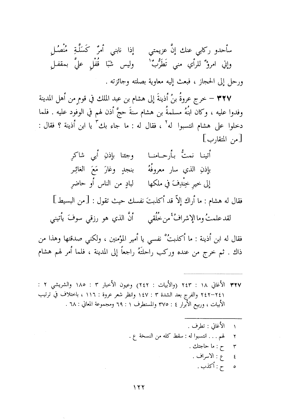 فقال له ابن أذينة: ما أكذبت [5] نفسي يا أمير المؤمنين، ولكني صدقتها وهذا من ذاك. ثم خرج من عنده وركب راحلته راجعا إلى المدينة، فلما أمر لهم هشام