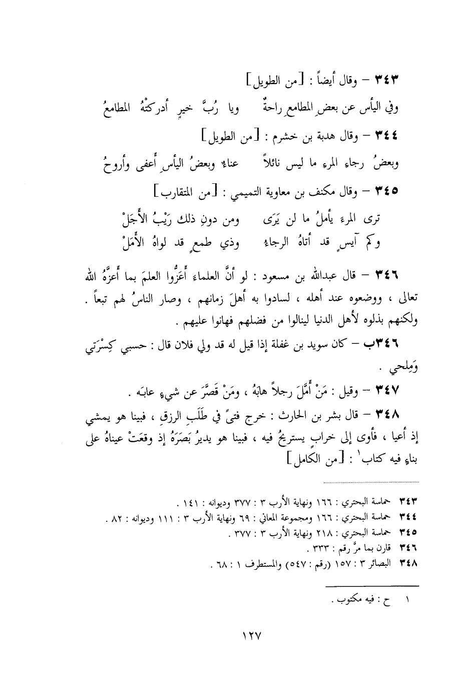 «348» - قال بشر بن الحارث: خرج فتى في طلب الرزق، فبينا هو يمشي إذ أعيا، فأوى إلى خراب يستريح فيه، فبينا هو يدير بصره إذ وقعت عيناه على بناء فيه كتاب [1] : [من الكامل]
