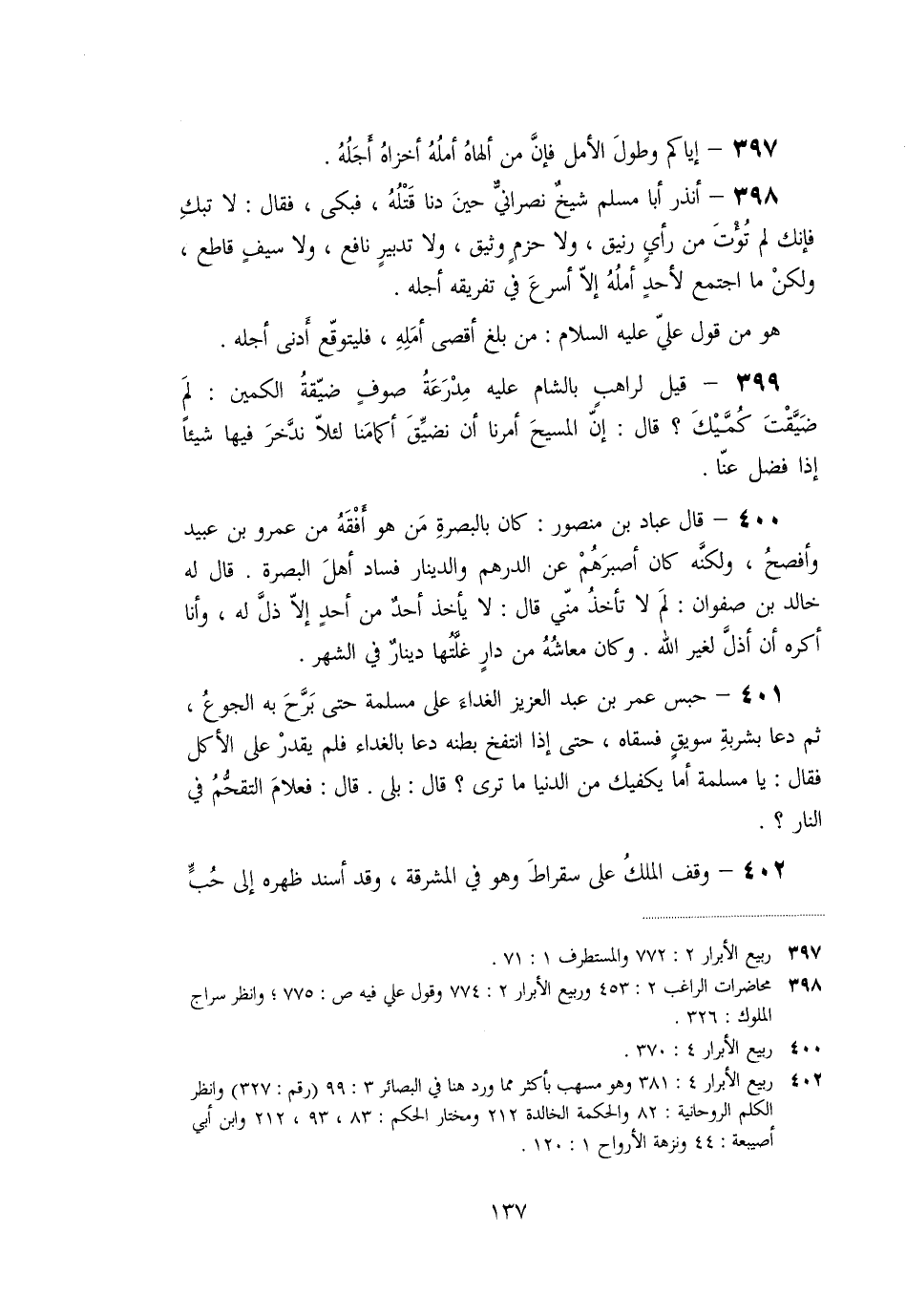 399- قيل لراهب بالشام عليه مدرعة صوف ضيّقة الكمين: لم ضيّقت كمّيك؟ قال: إنّ المسيح أمرنا أن نضيّق أكمامنا لئلّا ندّخر فيها شيئا إذا فضل عنّا.