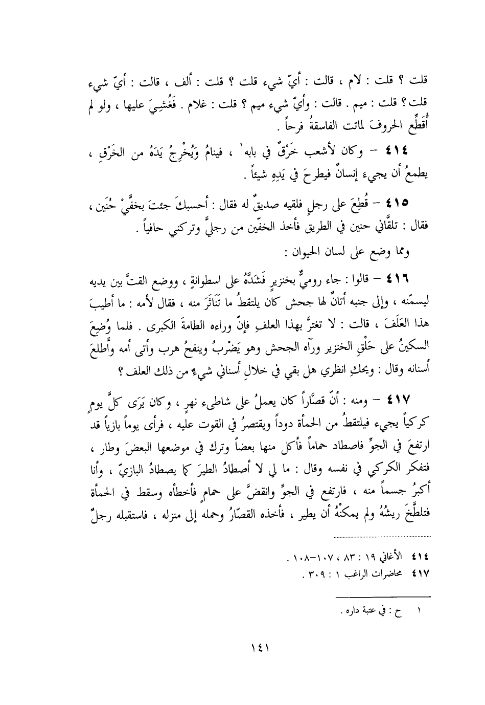 416- قالوا: جاء روميّ بخنزير فشدّه على اسطوانة، ووضع القتّ بين يديه ليسمّنه، وإلى جنبه أتان لها جحش كان يلتقط ما تناثر منه، فقال لأمه: ما أطيب هذا العلف، قالت: لا تغترّ بهذا العلف فإنّ وراءه الطامة الكبرى. فلما وضع السكين على حلق الخنزير ورآه الجحش وهو يضرب وينفح هرب وأتى أمه وأطلع أسنانه وقال: ويحك انظري هل بقي في خلال أسناني شيء من ذلك العلف؟