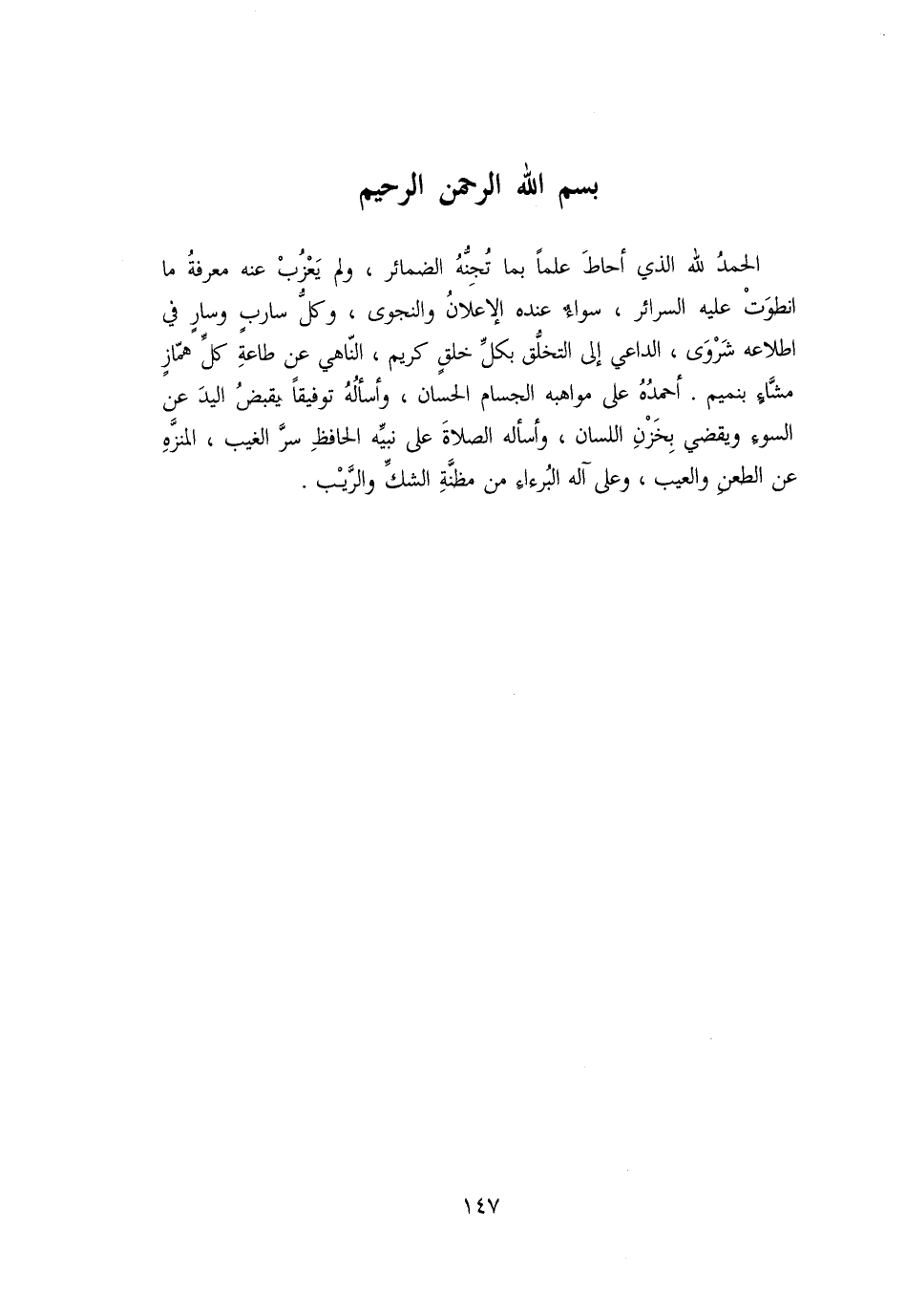 الحمد لله الذي أحاط علما بما تجنّه الضمائر، ولم يعزب عنه معرفة ما انطوت عليه السرائر، سواء عنده الإعلان والنجوى، وكلّ سارب وسار في اطلاعه شروى، الداعي إلى التخلّق بكلّ خلق كريم، النّاهي عن طاعة كلّ همّاز مشّاء بنميم. أحمده على مواهبه الجسام الحسان، وأسأله توفيقا يقبض اليد عن السوء ويقضي بخزن اللسان، وأسأله الصلاة على نبيّه الحافظ سرّ الغيب، المنزّه عن الطعن والعيب، وعلى آله البرءاء من مظنّة الشكّ والرّيب.