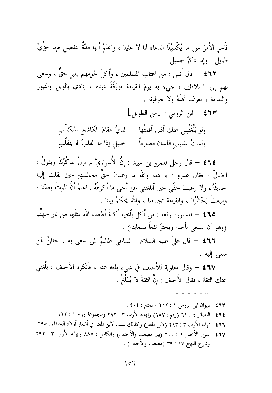 «467» - وقال معاوية للأحنف في شيء بلغه عنه، فأنكره الأحنف: بلّغني عنك الثقة، فقال الأحنف: إنّ الثقة لا يبلّغ.