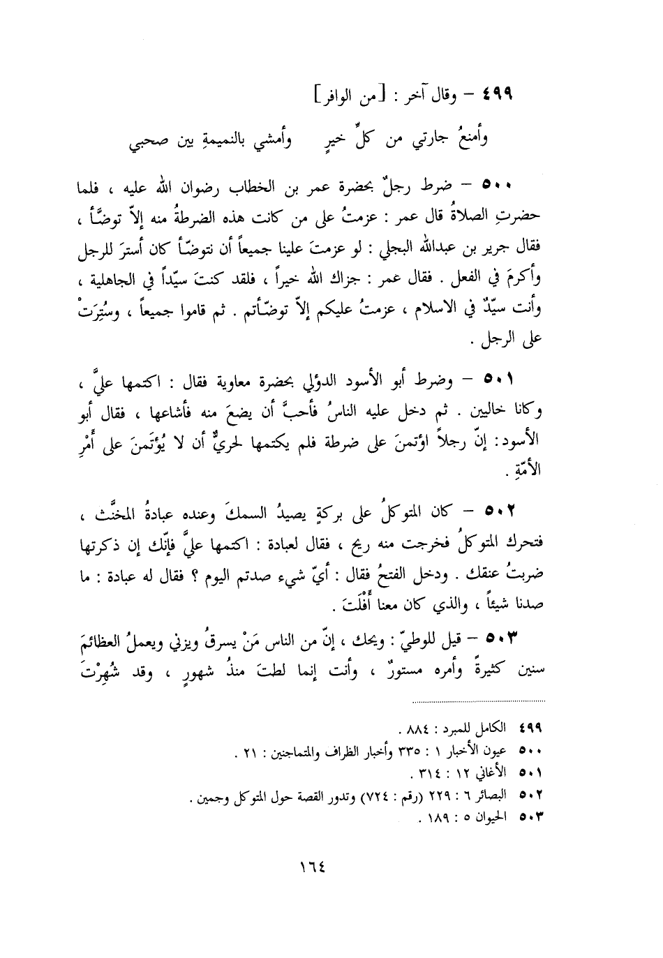 «500» - ضرط رجل بحضرة عمر بن الخطاب رضوان الله عليه، فلما حضرت الصلاة قال عمر: عزمت على من كانت هذه الضرطة منه إلّا توضّأ، فقال جرير بن عبد الله البجلي: لو عزمت علينا جميعا أن نتوضّأ كان أستر للرجل وأكرم في الفعل. فقال عمر: جزاك الله خيرا، فلقد كنت سيّدا في الجاهلية، وأنت سيّد في الاسلام، عزمت عليكم إلّا توضّأتم. ثم قاموا جميعا، وسترت على الرجل.