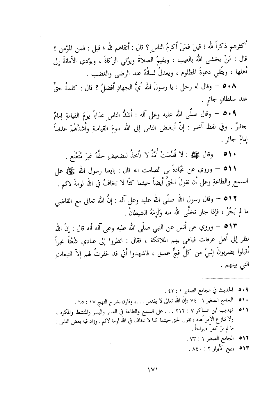 «511» - وروي عن عبادة بن الصامت انه قال: بايعنا رسول الله صلّى الله عليه وسلم على السمع والطاعة وعلى أن نقول الحقّ أيضا حيثما كنّا لا نخاف في الله لومة لائم.