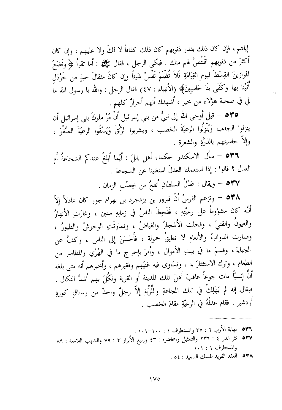 535- قيل أوحى الله إلى نبيّ من بني إسرائيل أن مر ملوك بني إسرائيل أن ينزلوا الجدب وينزلوا الرعيّة الخصب، ويشربوا الرّنق ويسقوا الرعيّة الصّفو، وإلّا حاسبتهم بالذرّة والشعرة.
