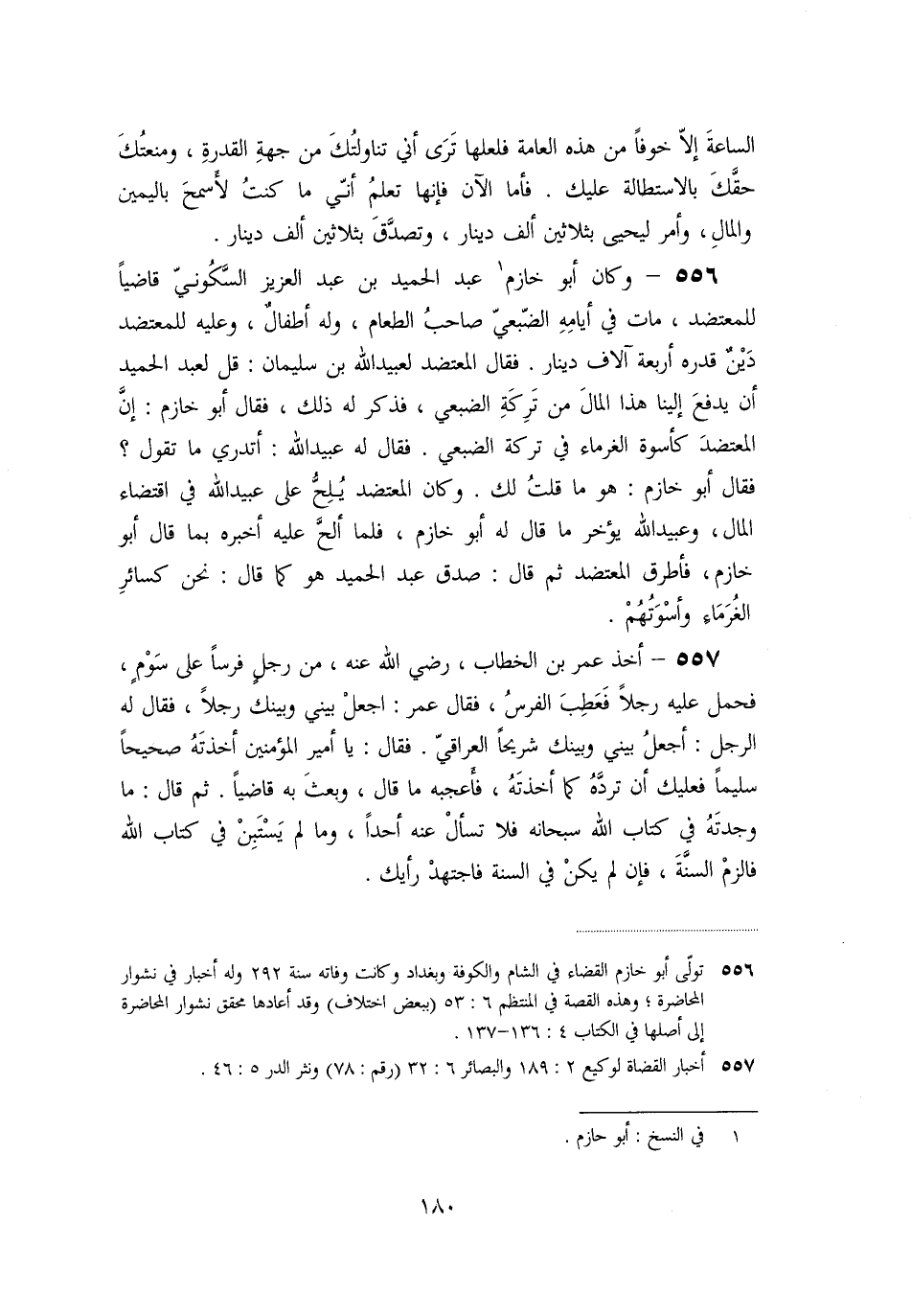 «556» - وكان أبو خازم [1] عبد الحميد بن عبد العزيز السّكونيّ قاضيا للمعتضد، مات في أيامه الضّبعيّ صاحب الطعام، وله أطفال، وعليه للمعتضد دين قدره أربعة آلاف دينار. فقال المعتضد لعبيد الله بن سليمان: قل لعبد الحميد أن يدفع إلينا هذا المال من تركة الضبعي، فذكر له ذلك، فقال أبو خازم: إنّ المعتضد كأسوة الغرماء في تركة الضبعي. فقال له عبيد الله: أتدري ما تقول؟