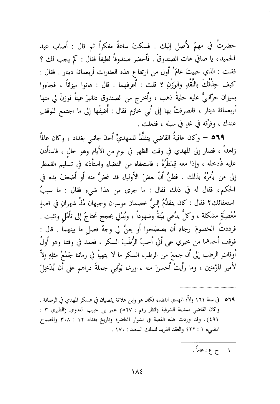 «569» - وكان عافية القاضي يتقلّد للمهديّ أحد جانبي بغداد، وكان عالما زاهدا، فصار إلى المهدي في وقت الظهر في يوم من الأيام وهو خال، فاستأذن عليه فأدخله، وإذا معه قمطره، فاستعفاه من القضاء واستأذنه في تسليم القمطر إلى من يأمره بذلك. فظنّ أنّ بعض الأولياء قد غضّ منه أو أضعف يده في الحكم، فقال له في ذلك فقال: ما جرى من هذا شيء فقال: ما سبب استعفائك؟ فقال: كان يتقدّم إليّ خصمان موسران وجيهان مذ شهران في قصة معضلة مشكلة، وكلّ يدّعي بيّنة وشهودا، ويدلي بحجج تحتاج إلى تأمّل وتثبت.