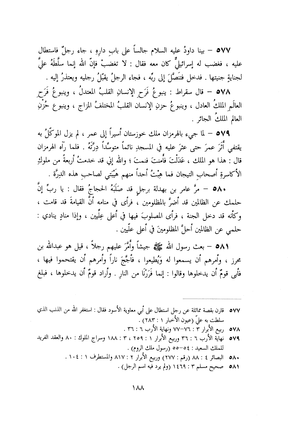 «578» - قال سقراط: ينبوع فرح الإنسان القلب المعتدل، وينبوع فرح العالم الملك العادل، وينبوع حزن الإنسان القلب المختلف المزاج، وينبوع حزن العالم الملك الجائر.