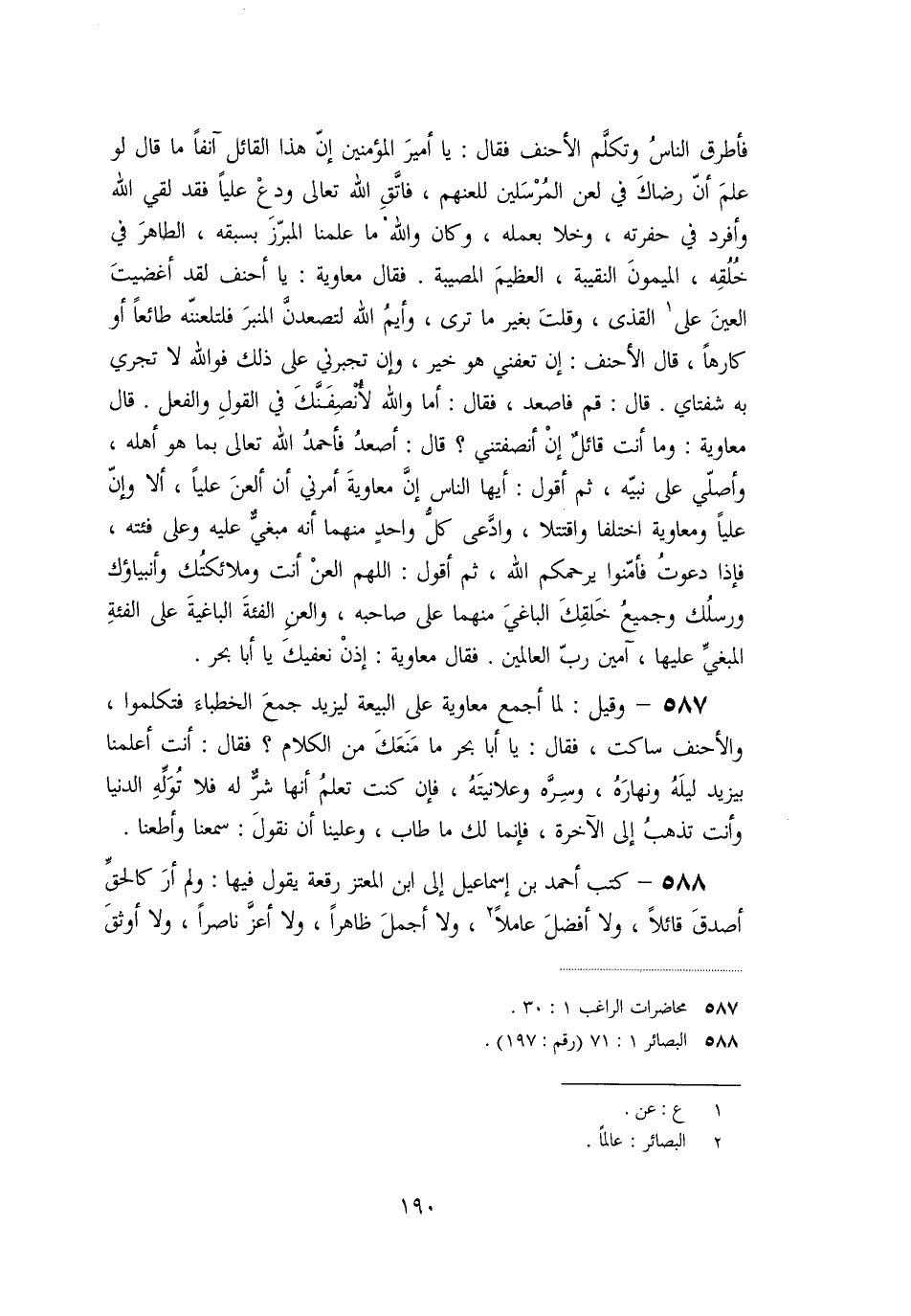 «587» - وقيل: لما أجمع معاوية على البيعة ليزيد جمع الخطباء فتكلموا، والأحنف ساكت، فقال: يا أبا بحر ما منعك من الكلام؟ فقال: أنت أعلمنا بيزيد ليله ونهاره، وسرّه وعلانيته، فإن كنت تعلم أنها شرّ له فلا تولّه الدنيا وأنت تذهب إلى الآخرة، فإنما لك ما طاب، وعلينا أن نقول: سمعنا وأطعنا.