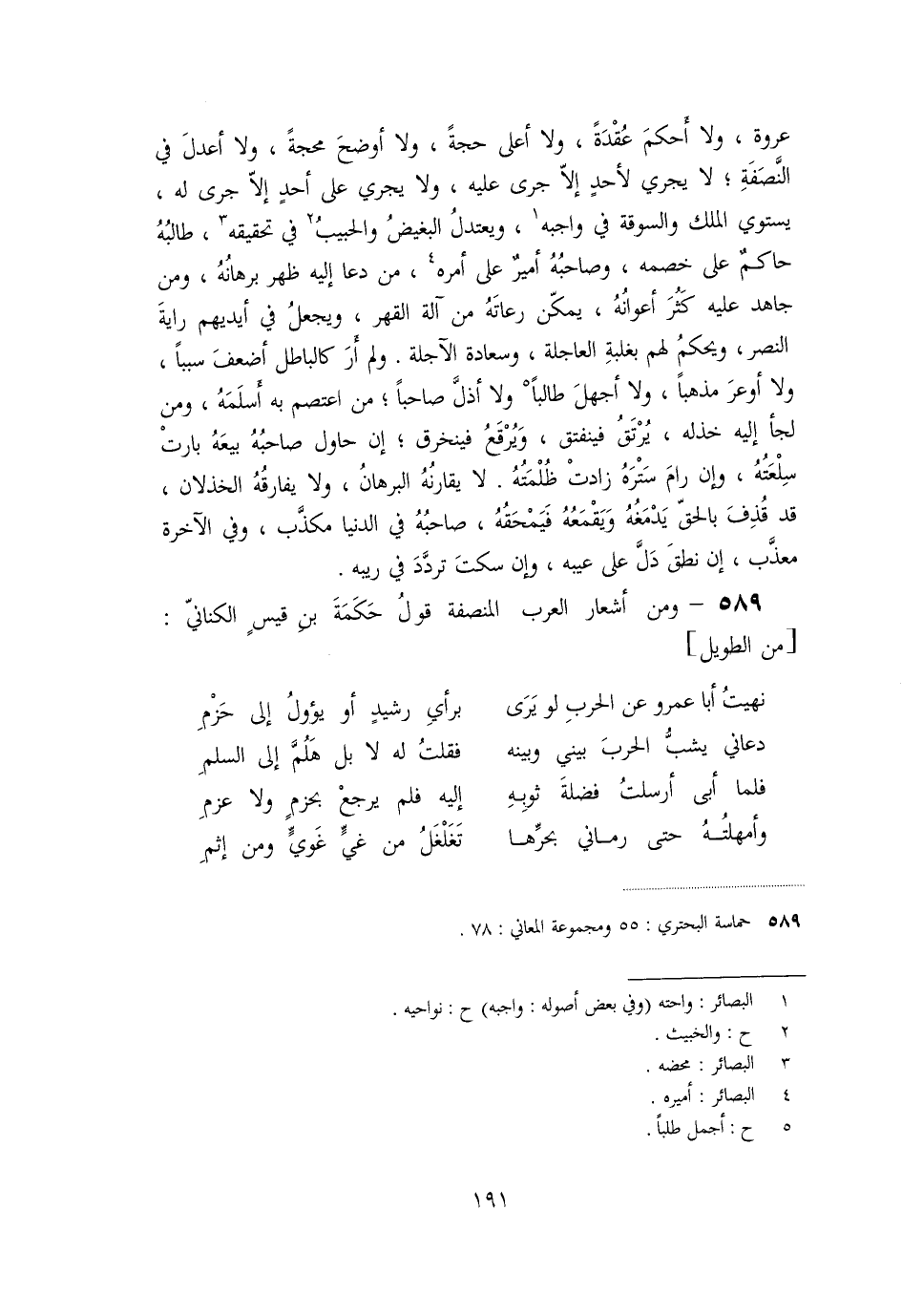 «589» - ومن أشعار العرب المنصفة قول حكمة بن قيس الكنانيّ: