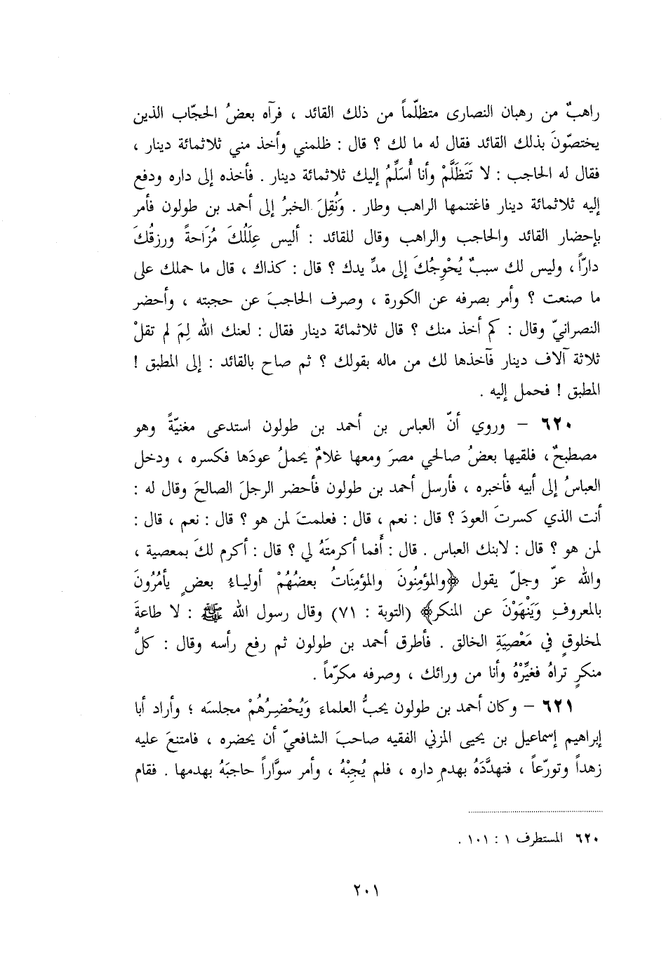 «620» - وروي أنّ العباس بن أحمد بن طولون استدعى مغنيّة وهو مصطبح، فلقيها بعض صالحي مصر ومعها غلام يحمل عودها فكسره، ودخل العباس إلى أبيه فأخبره، فأرسل أحمد بن طولون فأحضر الرجل الصالح وقال له:
