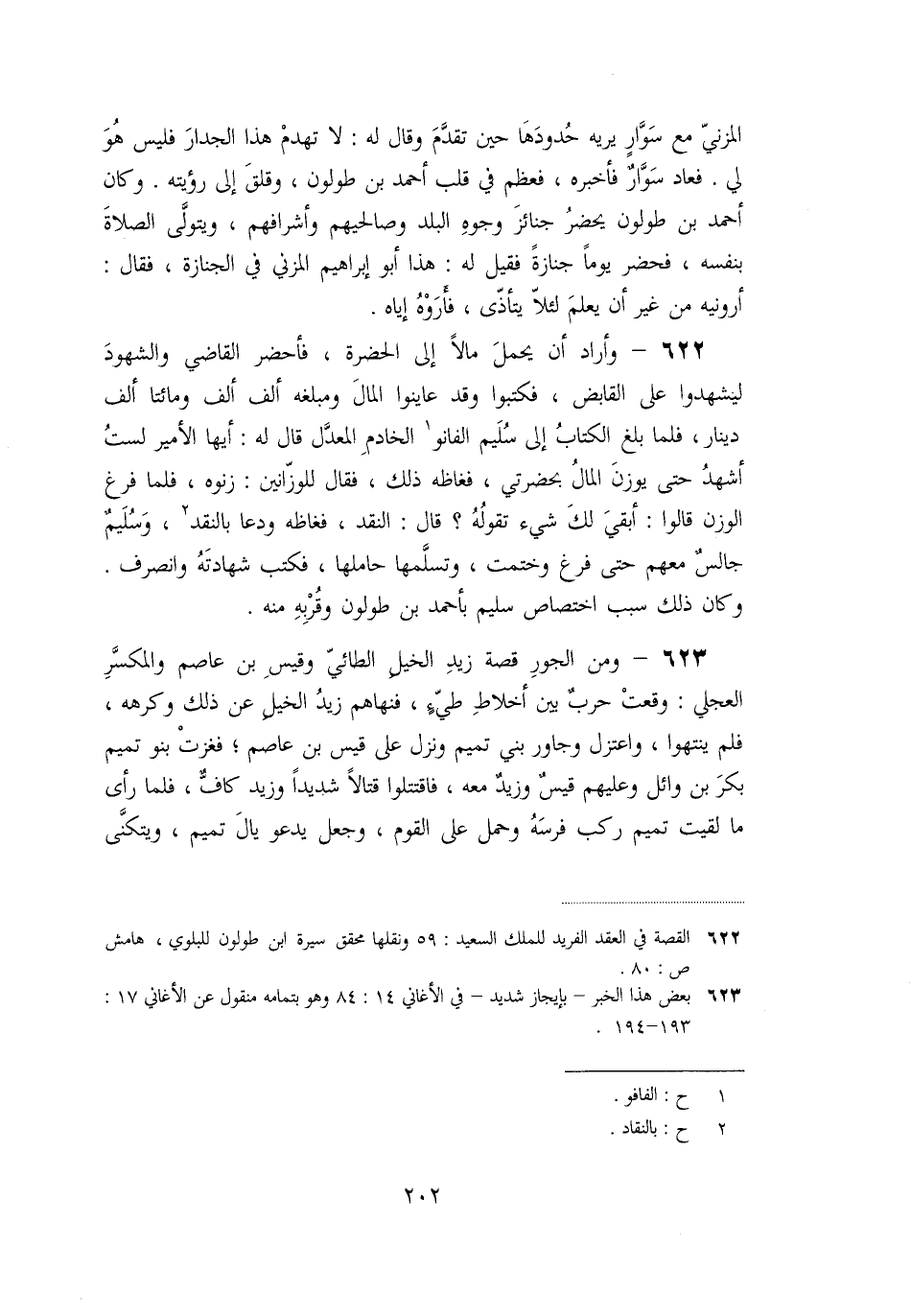«622» - وأراد أن يحمل مالا إلى الحضرة، فأحضر القاضي والشهود ليشهدوا على القابض، فكتبوا وقد عاينوا المال ومبلغه ألف ألف ومائتا ألف دينار، فلما بلغ الكتاب إلى سليم الفانو [1] الخادم المعدّل قال له: أيها الأمير لست أشهد حتى يوزن المال بحضرتي، فغاظه ذلك، فقال للوزّانين: زنوه، فلما فرغ الوزن قالوا: أبقي لك شيء تقوله؟ قال: النقد، فغاظه ودعا بالنقد [2] ، وسليم جالس معهم حتى فرغ وختمت، وتسلّمها حاملها، فكتب شهادته وانصرف.