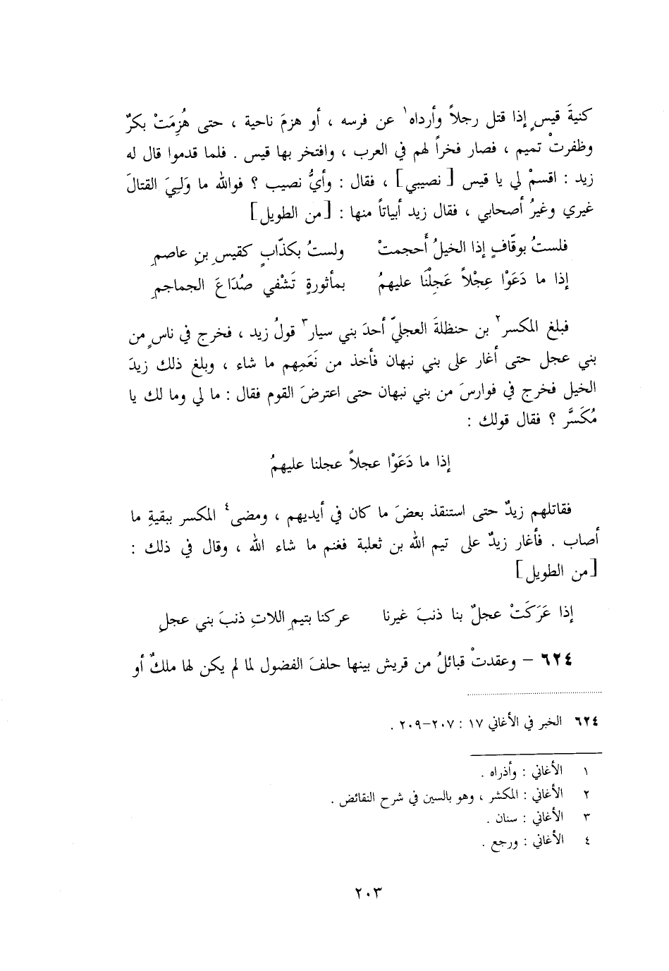 كنية قيس إذا قتل رجلا وأرداه [1] عن فرسه، أو هزم ناحية، حتى هزمت بكر وظفرت تميم، فصار فخرا لهم في العرب، وافتخر بها قيس. فلما قدموا قال له زيد: اقسم لي يا قيس [نصيبي] ، فقال: وأيّ نصيب؟ فو الله ما ولي القتال غيري وغير أصحابي، فقال زيد أبياتا منها: [من الطويل]
