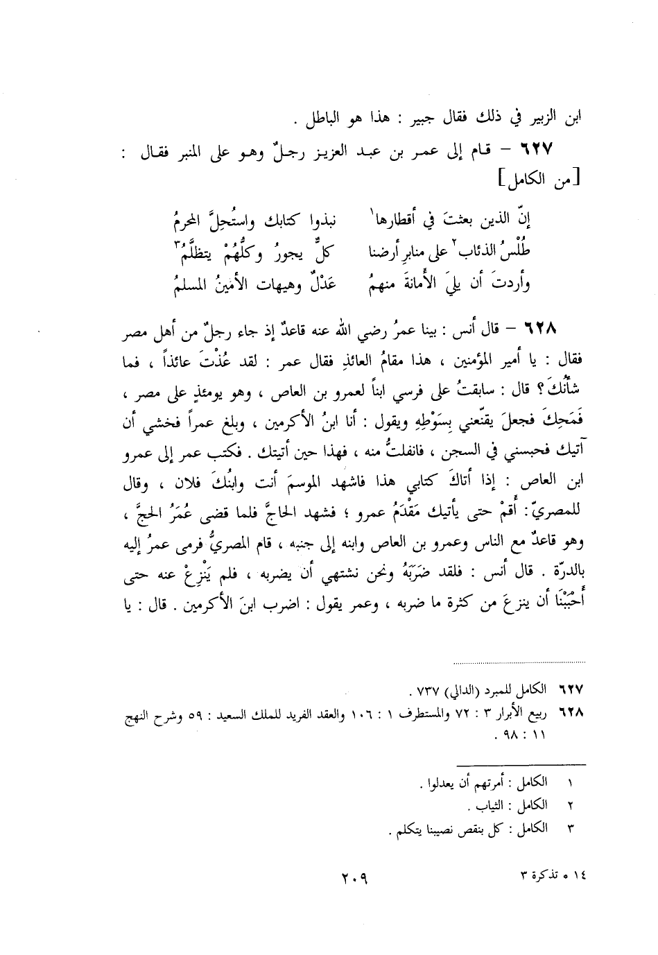 «628» - قال أنس: بينا عمر رضي الله عنه قاعد إذ جاء رجل من أهل مصر فقال: يا أمير المؤمنين، هذا مقام العائذ فقال عمر: لقد عذت عائذا، فما شأنك؟ قال: سابقت على فرسي ابنا لعمرو بن العاص، وهو يومئذ على مصر، فمحك فجعل يقنّعني بسوطه ويقول: أنا ابن الأكرمين، وبلغ عمرا فخشي أن آتيك فحبسني في السجن، فانفلتّ منه، فهذا حين أتيتك. فكتب عمر إلى عمرو ابن العاص: إذا أتاك كتابي هذا فاشهد الموسم أنت وابنك فلان، وقال للمصريّ: أقم حتى يأتيك مقدم عمرو؛ فشهد الحاجّ فلما قضى عمر الحجّ، وهو قاعد مع الناس وعمرو بن العاص وابنه إلى جنبه، قام المصريّ فرمى عمر إليه بالدرّة. قال أنس: فلقد ضربه ونحن نشتهي أن يضربه، فلم ينزع عنه حتى أحببنا أن ينزع من كثرة ما ضربه، وعمر يقول: اضرب ابن الأكرمين. قال: يا