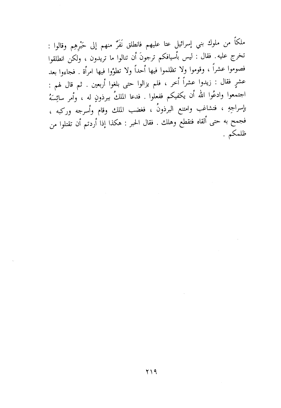 اجتمعوا وادعوا الله أن يكفيكم ففعلوا. فدعا الملك ببرذون له، وأمر سائسه بإسراجه، فتشاغب وامتنع البرذون، فغضب الملك وقام وأسرجه وركبه، فجمح به حتى ألقاه فتقطع وهلك. فقال الحبر: هكذا إذا أردتم أن تقتلوا من ظلمكم.