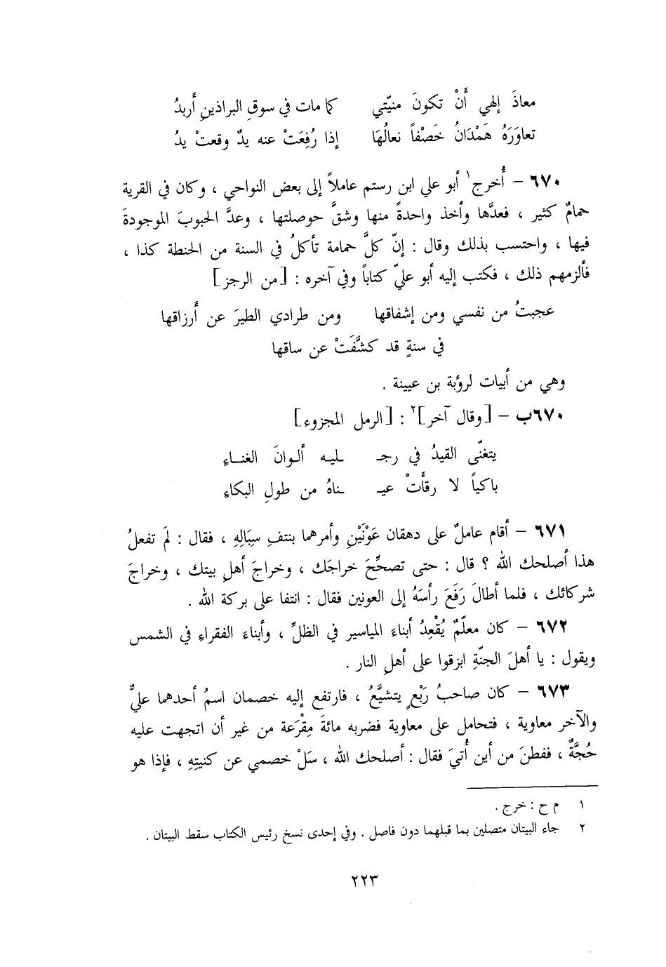 670- أخرج [1] أبو علي ابن رستم عاملا إلى بعض النواحي، وكان في القرية حمام كثير، فعدّها وأخذ واحدة منها وشقّ حوصلتها، وعدّ الحبوب الموجودة فيها، واحتسب بذلك وقال: إنّ كلّ حمامة تأكل في السنة من الحنطة كذا، فألزمهم ذلك، فكتب إليه أبو عليّ كتابا وفي آخره: [من الرجز]