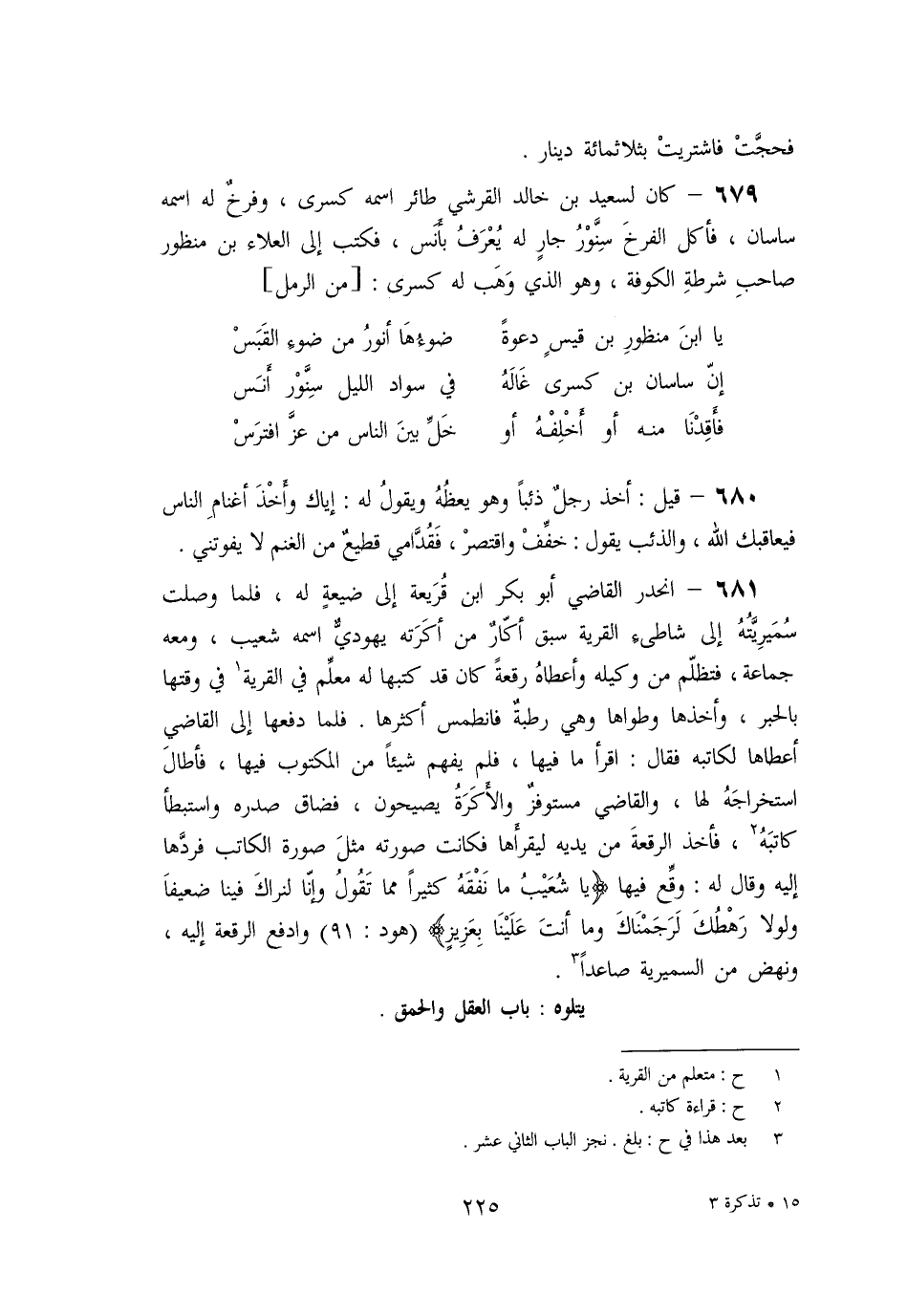 679- كان لسعيد بن خالد القرشي طائر اسمه كسرى، وفرخ له اسمه ساسان، فأكل الفرخ سنّور جار له يعرف بأنس، فكتب إلى العلاء بن منظور صاحب شرطة الكوفة، وهو الذي وهب له كسرى: [من الرمل]