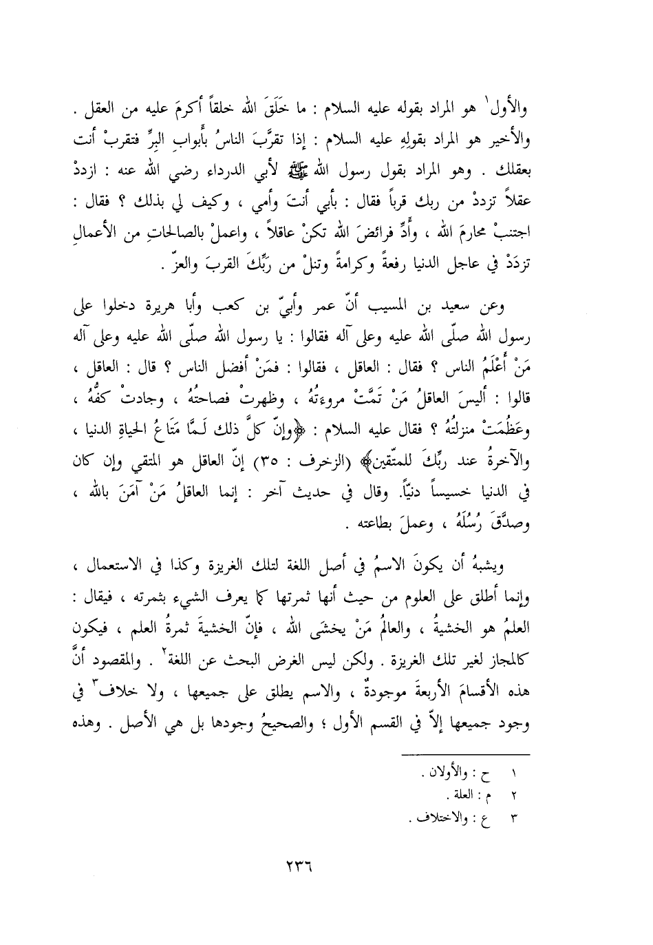 والأخير هو المراد بقوله عليه السلام: إذا تقرّب الناس بأبواب البرّ فتقرب أنت بعقلك. وهو المراد بقول رسول الله صلّى الله عليه وسلم لأبي الدرداء رضي الله عنه: ازدد عقلا تزدد من ربك قربا فقال: بأبي أنت وأمي، وكيف لي بذلك؟ فقال: