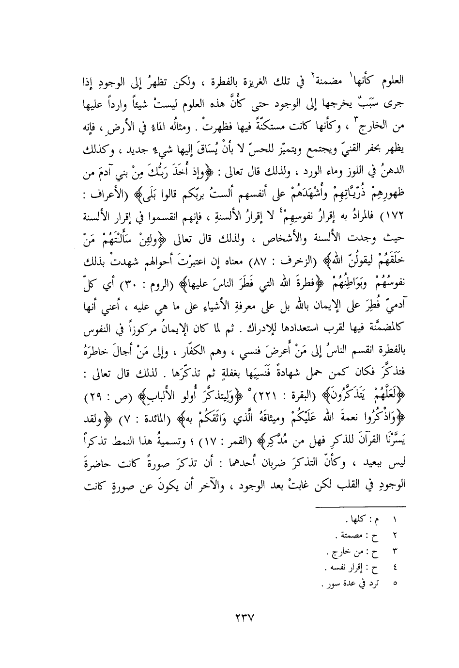 العلوم كأنها [1] مضمنة [2] في تلك الغريزة بالفطرة، ولكن تظهر إلى الوجود إذا جرى سبب يخرجها إلى الوجود حتى كأنّ هذه العلوم ليست شيئا واردا عليها من الخارج [3] ، وكأنها كانت مستكنّة فيها فظهرت. ومثاله الماء في الأرض، فإنه يظهر بحفر القنيّ ويجتمع ويتميّز للحسّ لا بأن يساق إليها شيء جديد، وكذلك الدهن في اللوز وماء الورد، ولذلك قال تعالى: (وَإِذْ أَخَذَ رَبُّكَ مِنْ بَنِي آدَمَ مِنْ ظُهُورِهِمْ ذُرِّيَّتَهُمْ وَأَشْهَدَهُمْ عَلى أَنْفُسِهِمْ أَلَسْتُ بِرَبِّكُمْ قالُوا بَلى)