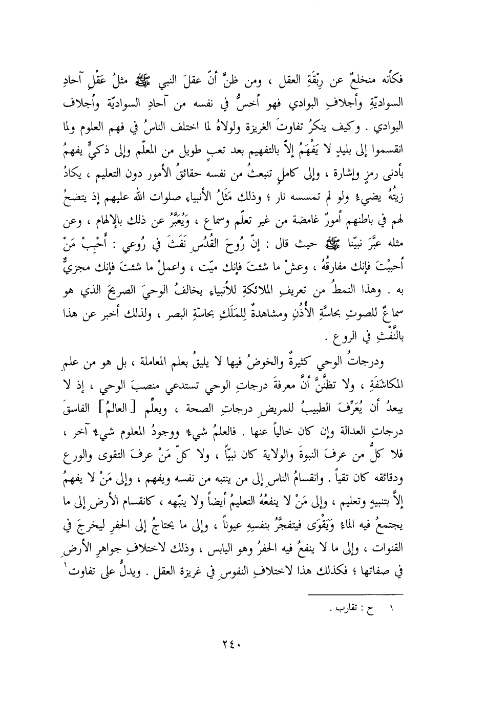 فكأنه منخلع عن ربقة العقل، ومن ظنّ أنّ عقل النبي صلّى الله عليه وسلم مثل عقل آحاد السواديّة وأجلاف البوادي فهو أخسّ في نفسه من آحاد السواديّة وأجلاف البوادي. وكيف ينكر تفاوت الغريزة ولولاه لما اختلف الناس في فهم العلوم ولما انقسموا إلى بليد لا يفهم إلّا بالتفهيم بعد تعب طويل من المعلّم وإلى ذكيّ يفهم بأدنى رمز وإشارة، وإلى كامل تنبعث من نفسه حقائق الأمور دون التعليم، يكاد زيته يضيء ولو لم تمسسه نار؛ وذلك مثل الأنبياء صلوات الله عليهم إذ يتضح لهم في باطنهم أمور غامضة من غير تعلّم وسماع، ويعبّر عن ذلك بالإلهام، وعن مثله عبّر نبيّنا صلّى الله عليه وسلم حيث قال: إنّ روح القدس نفث في روعي: أحبب من أحببت فإنك مفارقه، وعش ما شئت فإنك ميّت، واعمل ما شئت فإنك مجزيّ به. وهذا النمط من تعريف الملائكة للأنبياء يخالف الوحي الصريح الذي هو سماع للصوت بحاسّة الأذن ومشاهدة للملك بحاسّة البصر، ولذلك أخبر عن هذا بالنّفث في الروع.