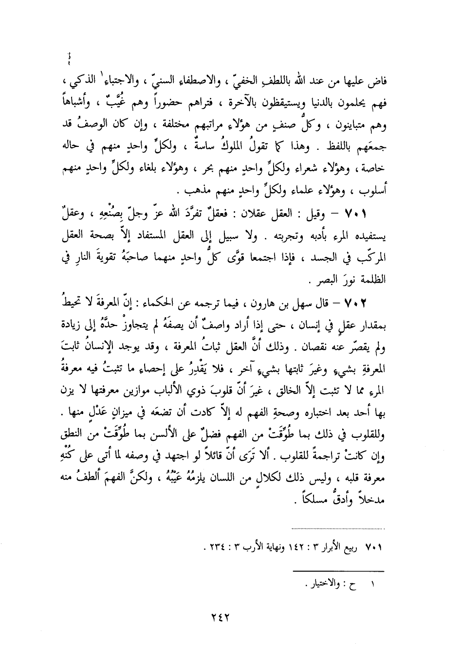 702- قال سهل بن هارون، فيما ترجمه عن الحكماء: إنّ المعرفة لا تحيط بمقدار عقل في إنسان، حتى إذا أراد واصف أن يصفه لم يتجاوز حدّه إلى زيادة ولم يقصّر عنه نقصان. وذلك أنّ العقل ثبات المعرفة، وقد يوجد الإنسان ثابت المعرفة بشيء وغير ثابتها بشيء آخر، فلا يقدر على إحصاء ما تثبت فيه معرفة المرء مما لا تثبت إلّا الخالق، غير أنّ قلوب ذوي الألباب موازين معرفتها لا يزن بها أحد بعد اختباره وصحة الفهم له إلّا كادت أن تضعه في ميزان عدل منها.