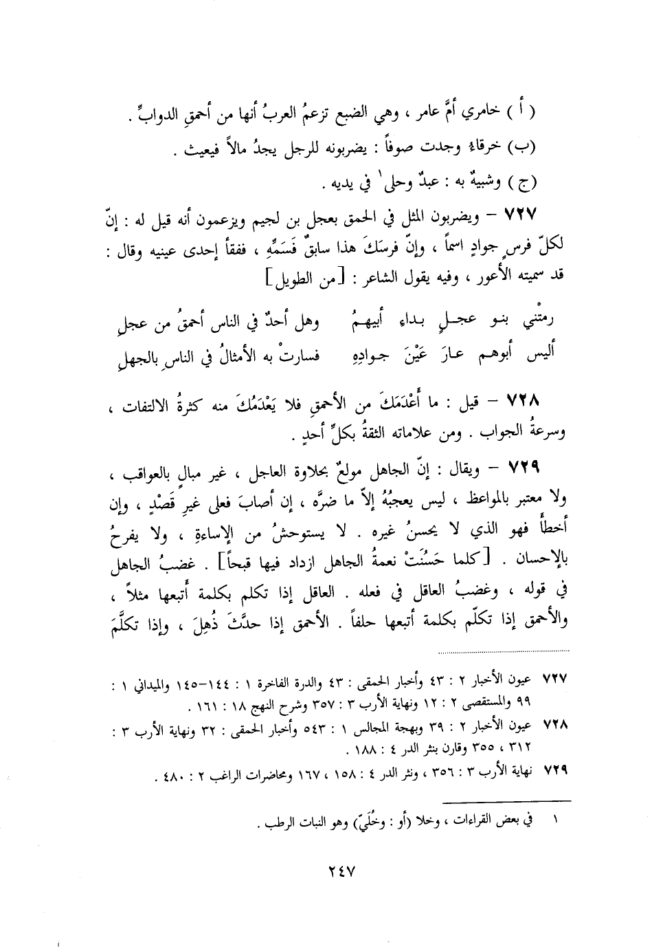 «728» - قيل: ما أعدمك من الأحمق فلا يعدمك منه كثرة الالتفات، وسرعة الجواب. ومن علاماته الثقة بكلّ أحد.